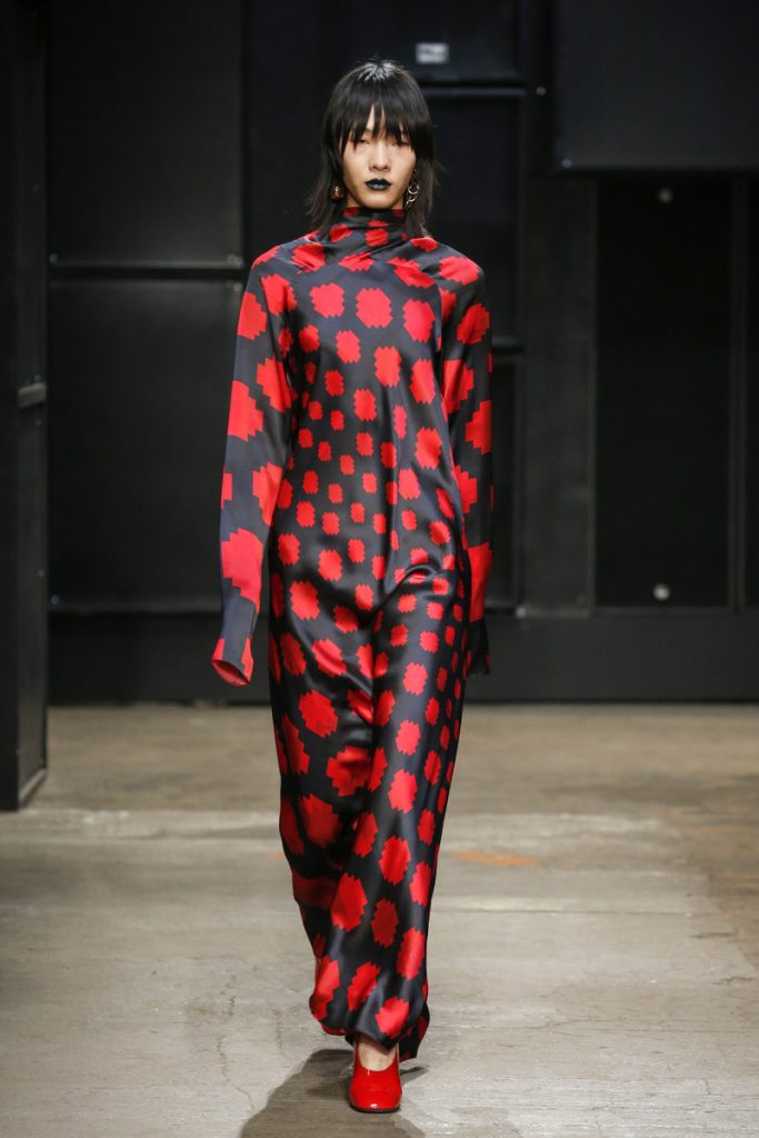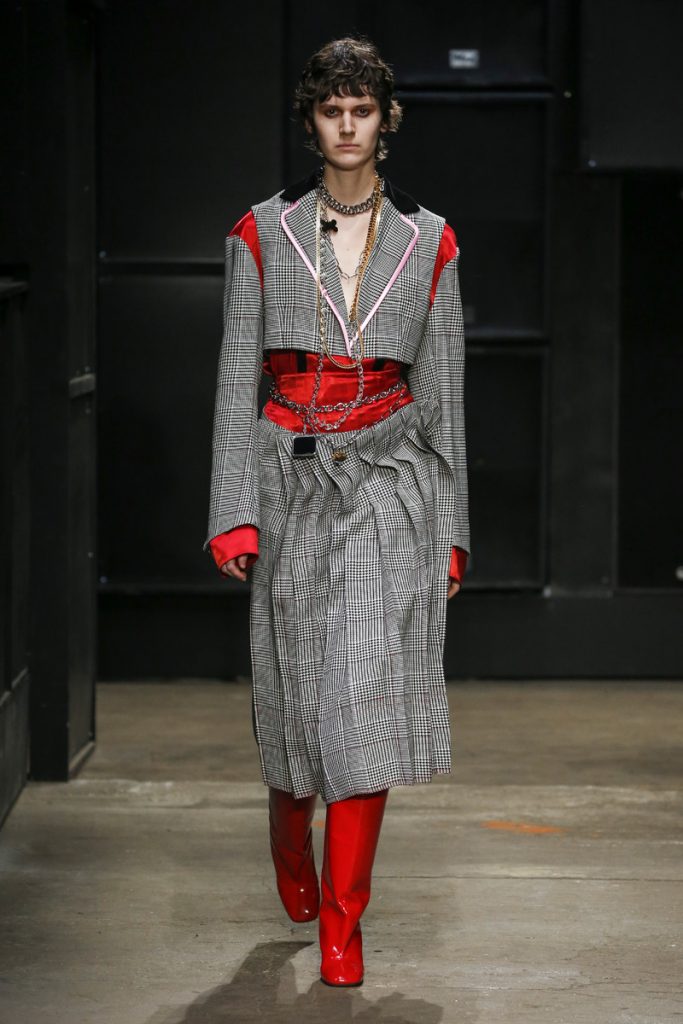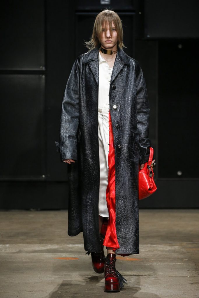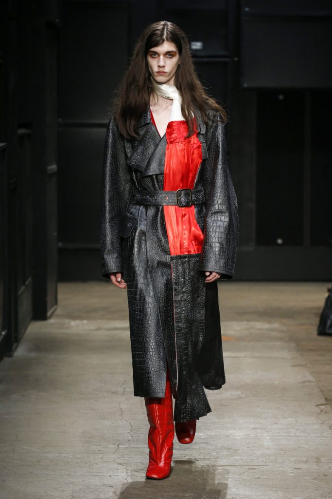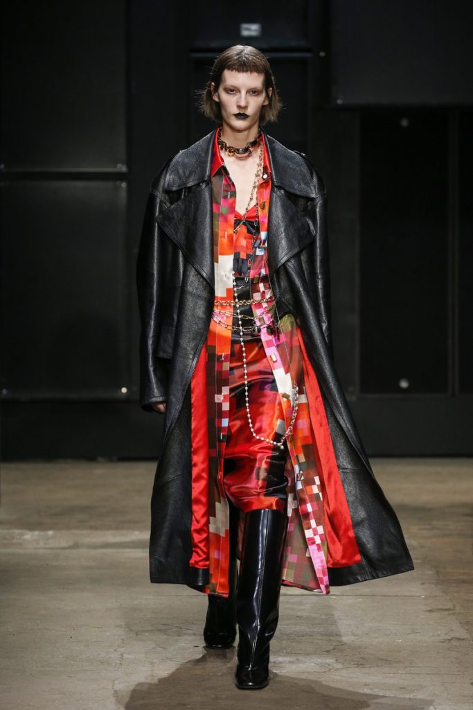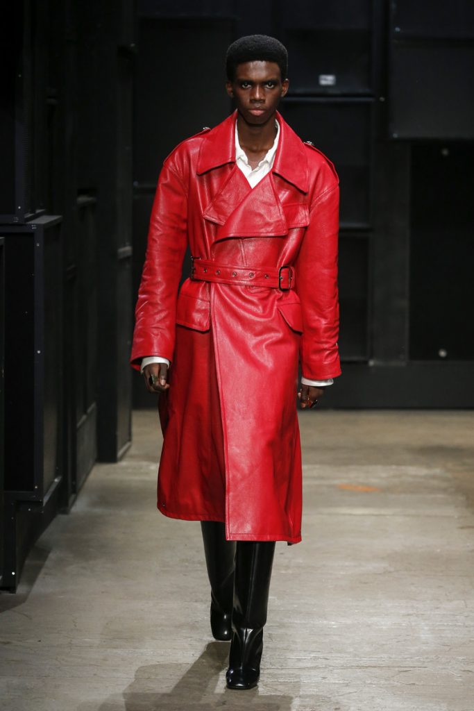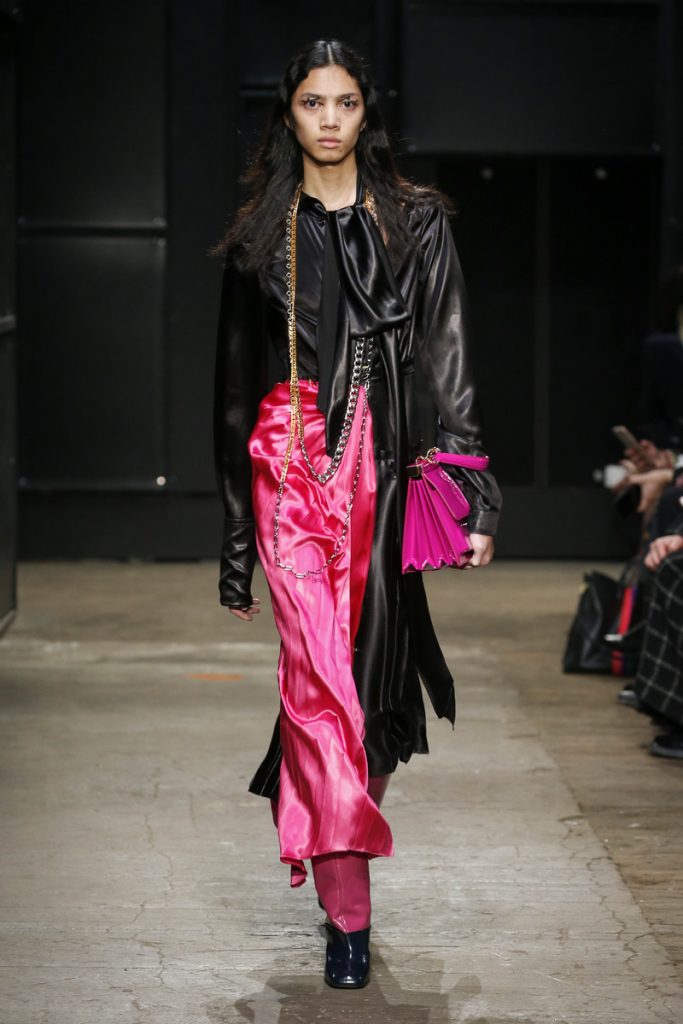 This sure wasn’t the most cheerful Marni collection to date. No for fw2019 Francesco Risso opted for dark and moody as his collection spoke of “pleasure without guilt”. This lead to long (tweed) skirts and matching jackets paired with the chunkiest boots (in red or black). His models had a zombie kind of stare, black lips and bold cut bangs. They sported XL chain necklaces, body chains and even a few harnesses (a theme this Milan fashion week!). There were heavy leather coats (one in mustard yellow particularly stood out), polka dot dresses that covered the entire body and duo colored belted skirts. A tough collection to fall for at first sight, but then again we still have some more months to get used to Risso’s fw2019 style code.