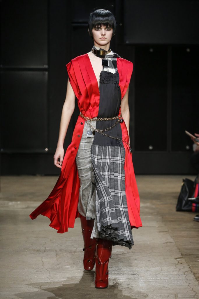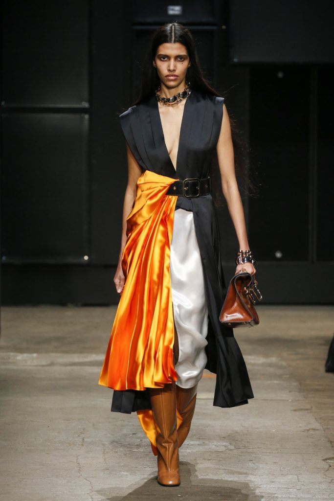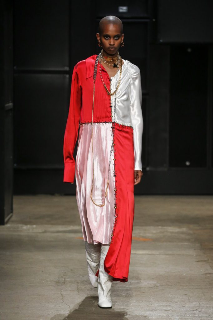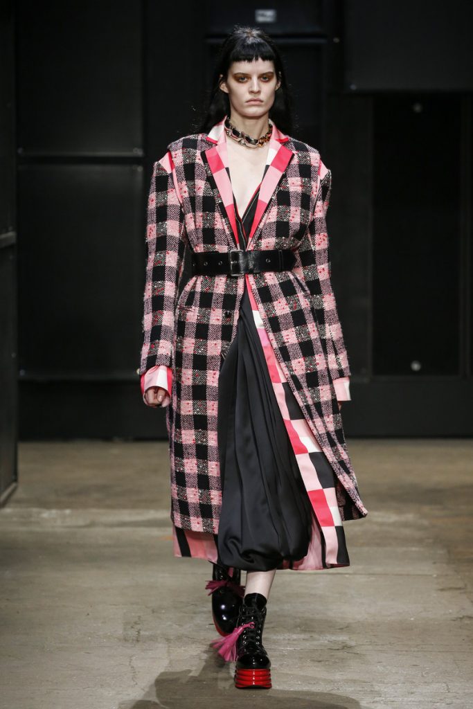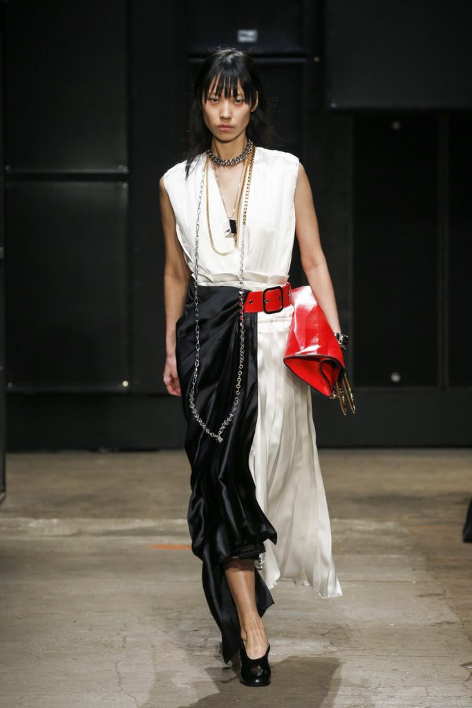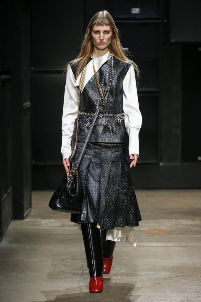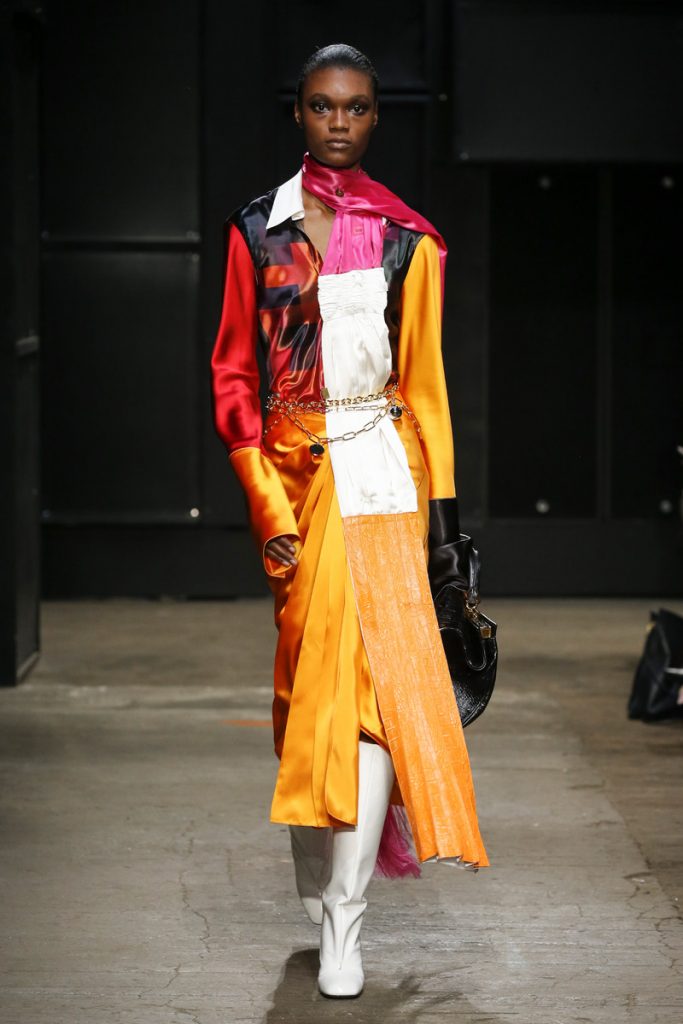 This sure wasn’t the most cheerful Marni collection to date. No for fw2019 Francesco Risso opted for dark and moody as his collection spoke of “pleasure without guilt”. This lead to long (tweed) skirts and matching jackets paired with the chunkiest boots (in red or black). His models had a zombie kind of stare, black lips and bold cut bangs. They sported XL chain necklaces, body chains and even a few harnesses (a theme this Milan fashion week!). There were heavy leather coats (one in mustard yellow particularly stood out), polka dot dresses that covered the entire body and duo colored belted skirts. A tough collection to fall for at first sight, but then again we still have some more months to get used to Risso’s fw2019 style code.