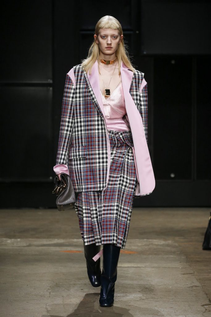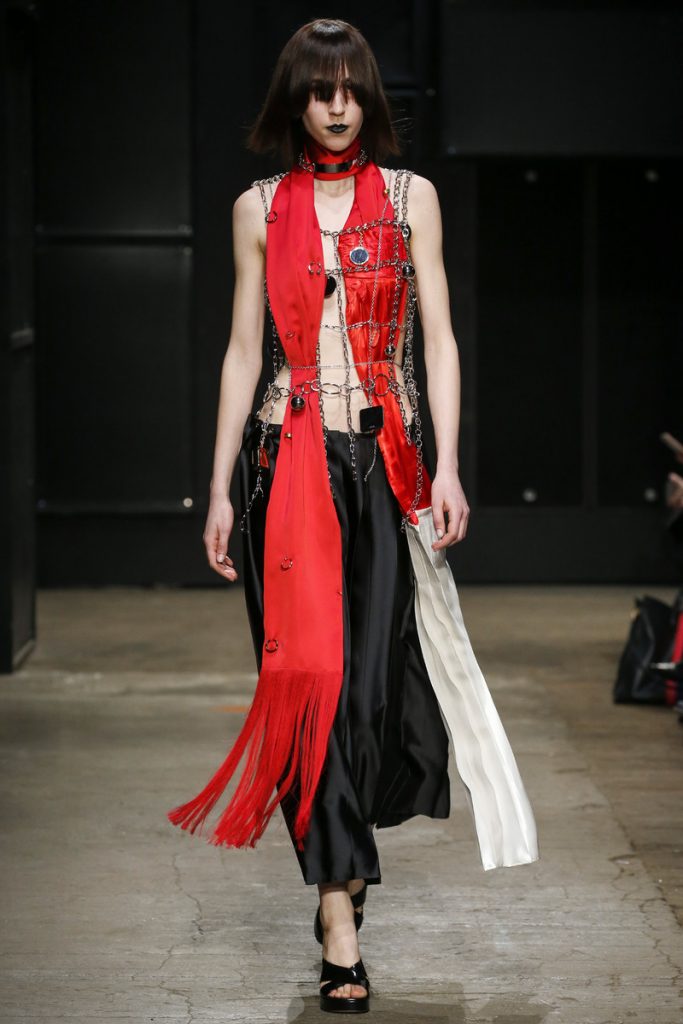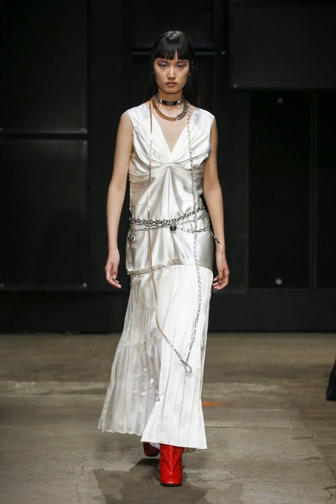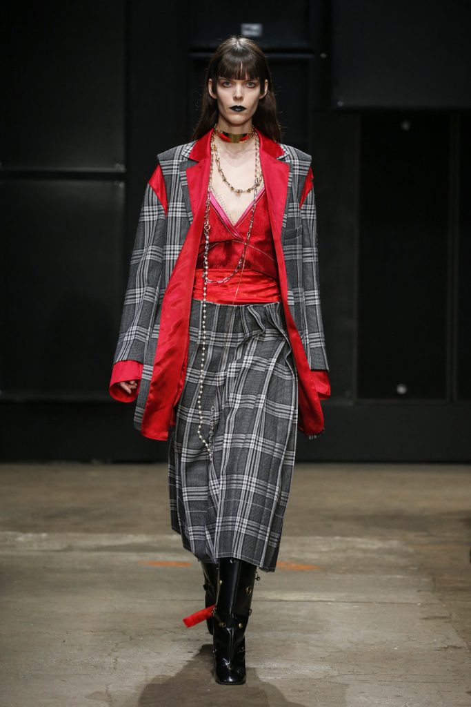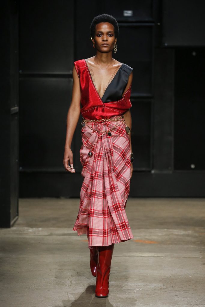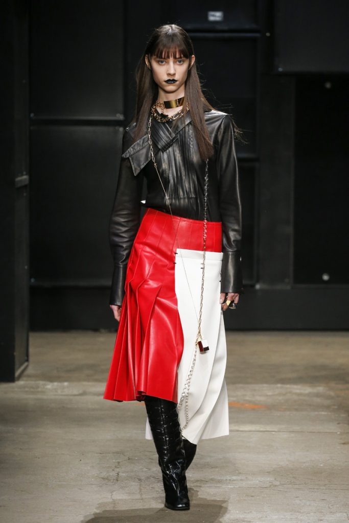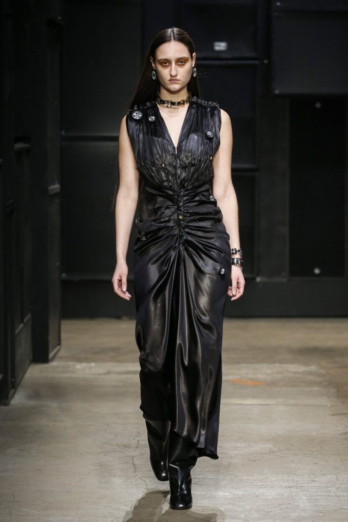 This sure wasn’t the most cheerful Marni collection to date. No for fw2019 Francesco Risso opted for dark and moody as his collection spoke of “pleasure without guilt”. This lead to long (tweed) skirts and matching jackets paired with the chunkiest boots (in red or black). His models had a zombie kind of stare, black lips and bold cut bangs. They sported XL chain necklaces, body chains and even a few harnesses (a theme this Milan fashion week!). There were heavy leather coats (one in mustard yellow particularly stood out), polka dot dresses that covered the entire body and duo colored belted skirts. A tough collection to fall for at first sight, but then again we still have some more months to get used to Risso’s fw2019 style code.