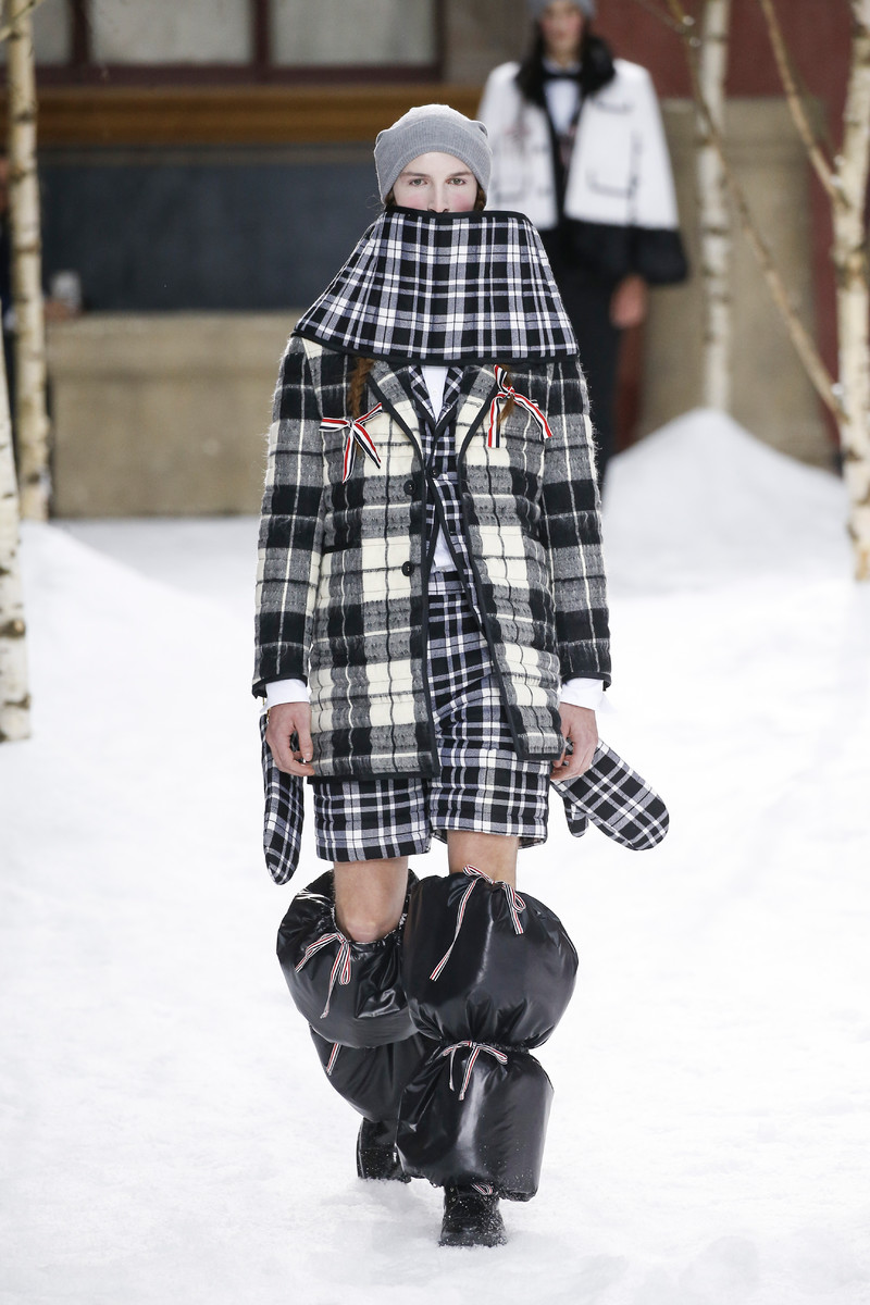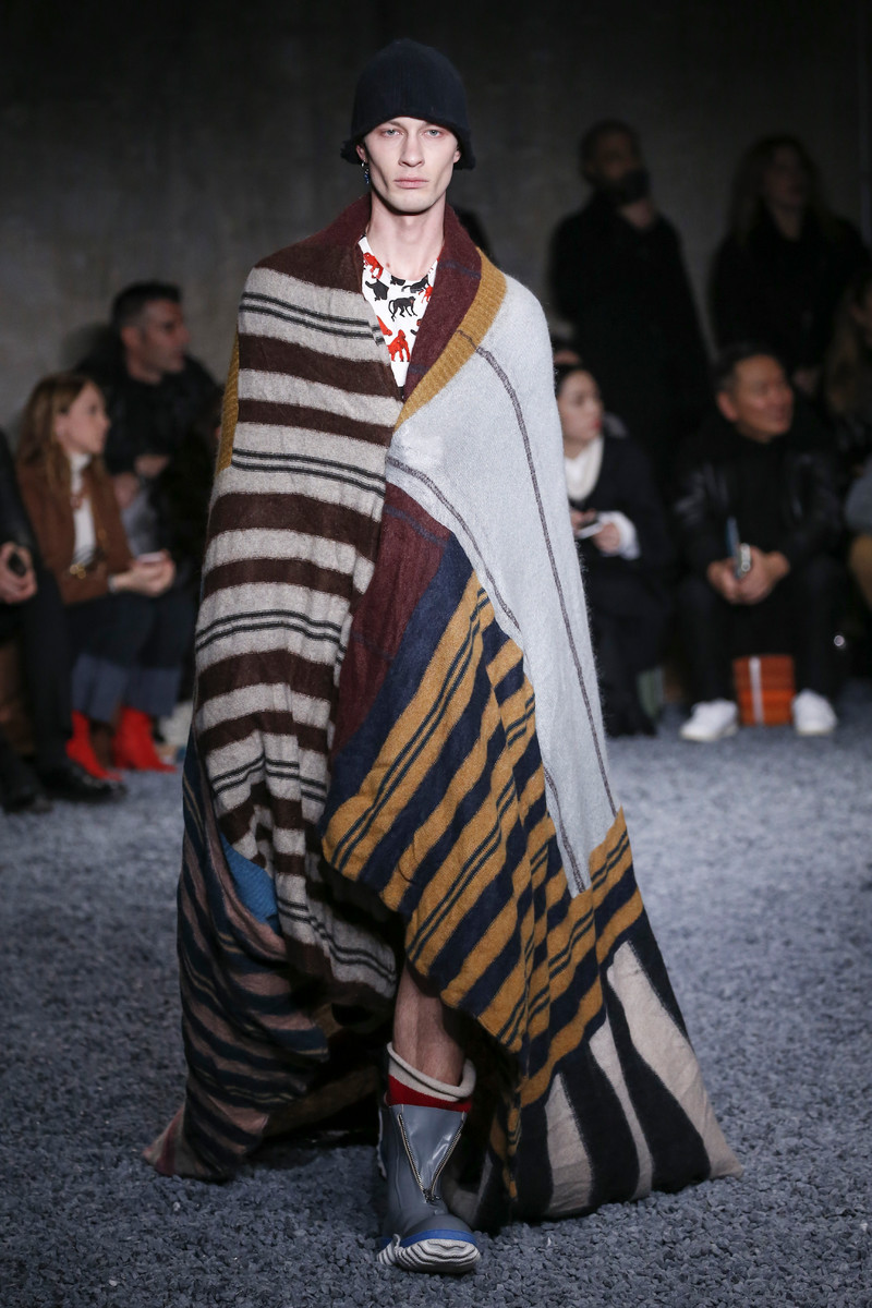 Even big guys get cold and so many menswear labels are going for the layered look. No matter how tall, strong or tough you are, you need to wrap up to bear winter temperatures. And it turns out a heavy coat is just not enough. Men need extra layers of body warmers (Bidjan, Sunnei), thick scarves and puffer boots – don’t get cold feet now!- (Thom Browne), beanies (RaeBurn) and head wraps (Margiela). Rolling straight from sofa to streetwalk, while still covered up in your fav blanket (as seen at Marni) is even allowed when temperatures drop. Winter is here, make sure you’re well prepped!