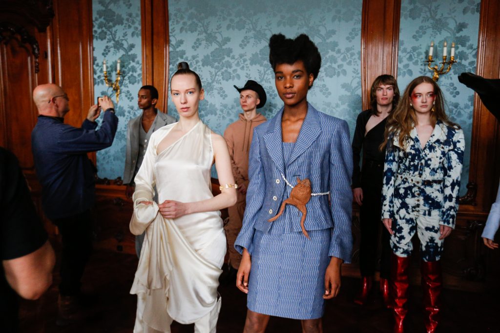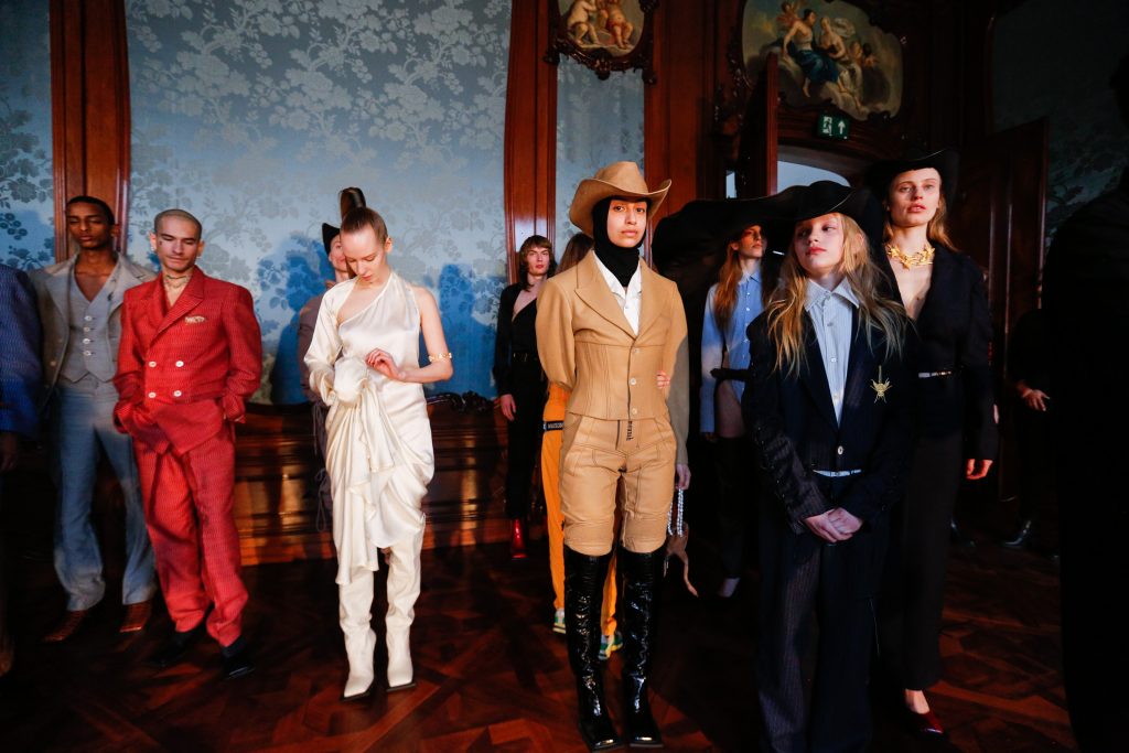 No straightforward fashion show but a tableau vivant named “Evolve Around Me” awaited us at Ninamounah. At the loveliest location in the city centre, Huis Bartolotti, press, family and friends of the label gathered in the living room. A diverse selection of 15 models walked into to room and took their pose. A man playing the cello set the mood as an artist made a live painting of the setting. Models wore suits, chaps, draped dresses, 3D pieces and cowboy hats. They looked fierce, sophisticated and sexy.