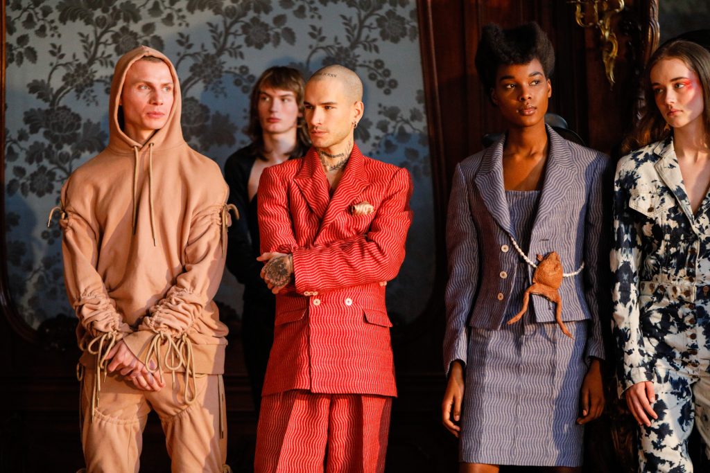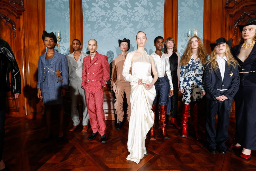 Or, as the show notes described it: “Collection 004 Evolve Around Me looks at dominance and submission through the lens of evolution. Humans are the only animals riding other animals. Humans like to see themselves dominating the animal kingdom, whip in hand. With a strong stallion in between our legs we ride into the sunset dressed in the skins of other species. Treating fashion as an organism that constantly adjusts itself to different environments, such as seasonal changes and natural selection, iconic garments are clashed and melted together to create new shapes; pinstripe suits reference leather motor two-pieces and shirting comes in the shape of a high-cut bodysuits. Sharp tailoring is merged with historical corsetry, two disciplines meant to distort the human shape. Cowgirl silhouettes are moulded into sensual garments using flowing materials that embrace the body. Red, the most aggressive colour on the spectrum, is contrasted with soft beiges and cream.”