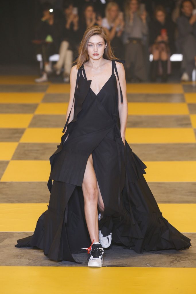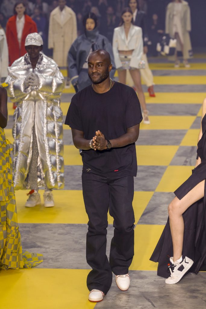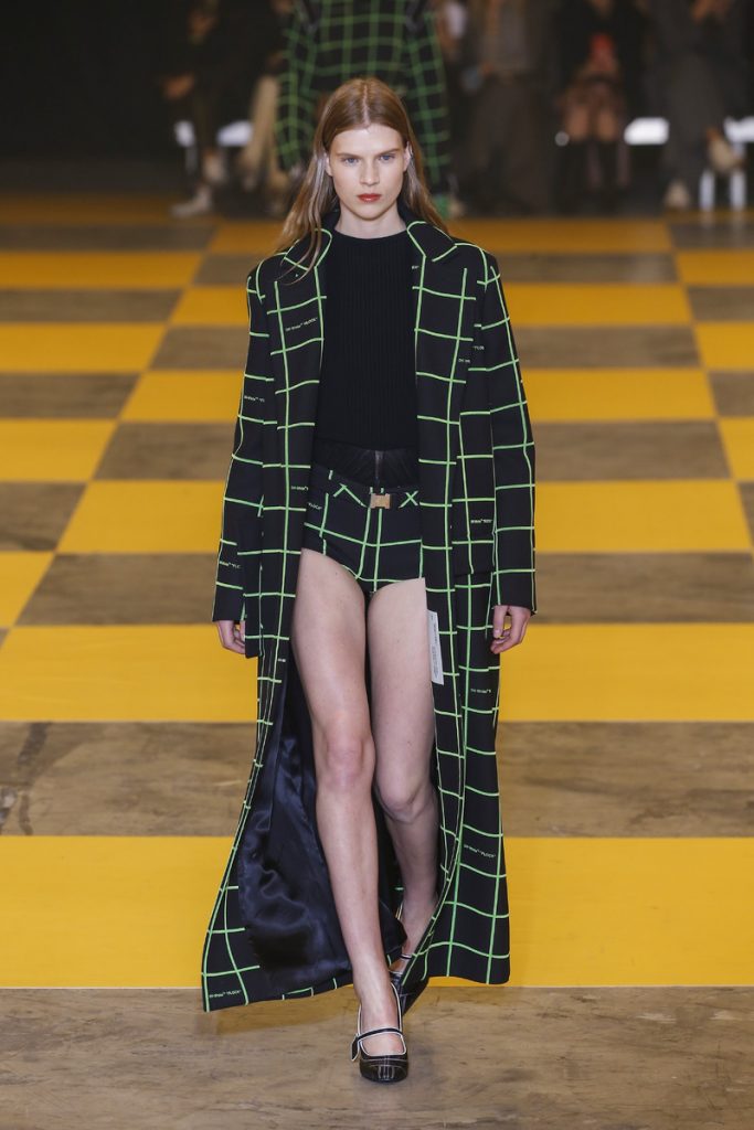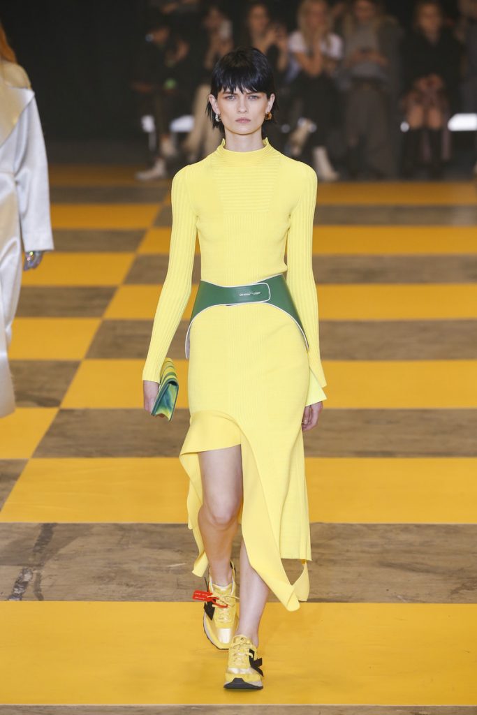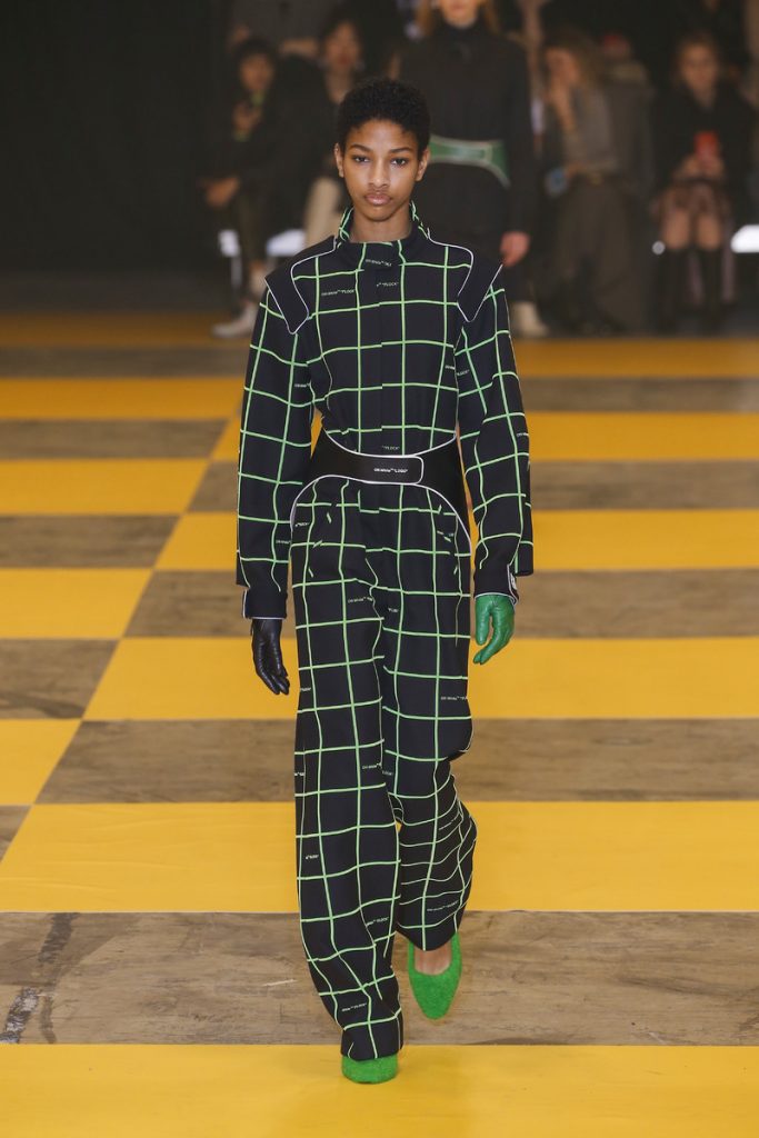 Like with his last collection this Off-White collection was a bit more dressed up. Streetwear with a chic, lady like touch. Tailored belted coats, sculptural asymmetrical suits (shapes inspired by twisted car-crash sculptures), heavy leather jackets (one is shiny silver), a motor sport inspired puffer, a giant silver colored puffer (@itsmaymemes come to reality). A navy colored tuxedo with a shiny silky right have looked extra sharp. Loose bleached denim pants here as well. And all that yellow and green felt very Spring-y. The checked pattern was a reference to the crash derby race car culture, a play on the checkered flag. The finale of floor sweeping gowns added some drama to the collection. Yet no matter the chic-er take on his line these dresses still looked a little too casual for the red carpet. But who knows, some statement making it-girl (and Virgil is friends with a lot of them) might rock one of these looks at the Met Gala.