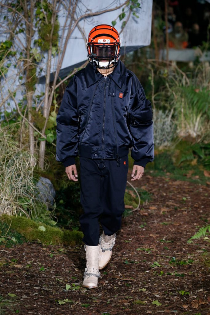 The collection was titled “Public Television” and boy was it an entertaining show. On an outdoor path the models appeared wearing their casual meets formal Off-White looks. The opening look, an XL denim jeans (inspired by JNCO jeans) and an oversized navy jacket, set the mood. The jeans stayed extra large, the jackets remained boxy. The latter just came out in several variations, with checks and branded patches. With look 12 Virgil Abloh sent out a long puffer body warmer. Halfway throughout the show rapper Offset (such a match!) entered in a long lilac colored puffer coat. We even spotted a pair of lilac puffer pants! A few sporty looks, including helmets and cowboy boots and a duo of girls in floral printed body suits added to the entertainment factor of the show. The bright orange, green and yellow at the end of the show fit the label’s signature. A less street/sportswear-y Off-White collection than we’d expected, but a very interesting one nevertheless.