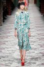 Gucci’s new designer Alessandro Michele has some big shoes to fill, following up on Tom Ford’s version and Frida Giannini’s fashion eye. The heavy bearded Italian, who was appointed the new creative director of the billion-dollar Italian luxury brand at the beginning of this year, showed his third collection and took his feminine, rose-tinted ideas forward. History always looks better second or third time around, especially when you leave it to the hands of Michele. The women he sent out yesterday seem to be coming straight out of the seventies. The flared trousers and suits, bold glitter glasses, botanical embroidery crawling over, bow ties everywhere (how fun was the pineapple tie), lots of colour, the long sweepy dresses, ruffles from head to toe and what about the rick-rack trims. There was also a huge focus on fabrics: 18th Century brocades, metallic leathers, iridescent organzas, macramé and floral chiffons. All mixed and matched together. Everything was rich in detail and well thought. No room for nonchalance, modesty or primness, but enough room for romance and femininity. Underlined with many bold accessories, from dazzling bags to flower earrings and rings, dangling on arms and fingers. Some looks almost seamed like drawings on the model’s body. The collection may be quite bold or ‘naked’ for some of us, but it was full of want-it-now items.