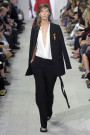 After Donna Karan went out with a bang last season fresh faces at the DKNY designer’s desk Dao-Yi Chow and Maxwell Osborne took over. Yesterday they presented their first collection for the brand inspired by what is perhaps Donna Karan’s most iconic fashion piece: the pinstripe power suit. They kept things very clean and simple, which gave the DKNY girl a super sophisticated and modern update. In a monochrome palette (we spotted just two touches of blue at the end of the show) the designers introduced a boxy blazer (worn by Maartje Verhoef) as a dress, a pinstriped pencil skirt matched with a basic white Tee and the most plain white playsuit. Simple, plain, elementary, yet never dull. Chow and Osborne made sure of that by sending out multiple variations of that particular power suit. The jackets double breasted and roomy. The dresses layered and asymmetric. Sheer T-shirts slowly transformed into a selection of sheer midi finale dresses. Loose hanging straps and chic simple clutches were the only accessories of the show. Were there enough new elements to give DKNY it’s own identity without the label’s founder on board? We’re not sure yet. But this was a show stuffed with youthful, commercial looks any NYC-girl would want to wear. No doubt about it. And while her autobiography hits stores this week Donna Karan herself approved of this collection by attending from her front row seat. New beginnings just had a great start.