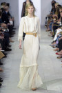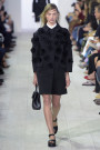 Of course, designers look back for inspiration all the time. Yet not often do classic and modern blend so well together as they did at Rodarte. Inspired by poets like Elizabeth Barrett Browning and Emily Dickinson designers Kate and Laura Mulleavy came up with an eclectic Victorian collection. Lots of lace and fur, appliqués and sparkles. To attend a fancy dinner or hit the dance floor. Dressed up yet not too costume-y. With long silky scarves, metal belts and extra long sleeves focusing on neck, waist and cuffs. Hair accessories and XL earrings added to the drama of the looks, which presented on an icy runway, appeared more winter than summer. Okay, those giant fur coats like the pale pink one worn by Laura Julie might have had something to do with that too. This was nostalgic Hollywood glitter with a light modern touch. Glam rock done in the most elegant way with lots of attention for detail. Disco chic with a movie star touch. And that is where we approach Kate and Laura’s other project, directing upcoming movie Woodshock. An exciting new step in their careers that luckily didn’t affect their exquisite taste and talent in fashion designing.