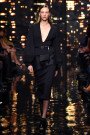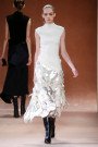 All of the details, the design equivalent of puns, were part of Wang’s playful spirit, yet the attitude of the show was seriously aggressive. The models stomped out in extreme platform lug-sole combat boots with wet stringy hair covering their zombie faces. Two fitted velvet crop tops, worn with skirts that swished with silver fringe, were womanly in a witchy way, but there was not a soft side to this collection. Wang was unflinching in his point of view and there’s a lot to be said for such conviction.