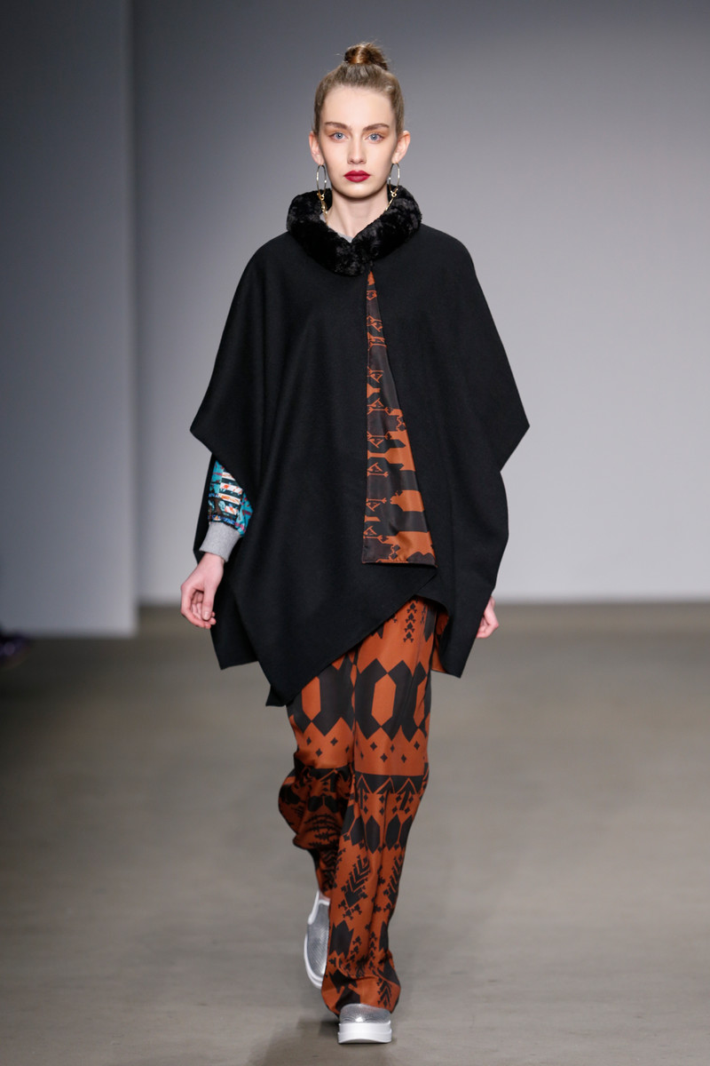 Romanian designer Smaranda Almasan expierenced her AFW debut on Sunday evening. A colorful introduction to conclude the forth day of fashion. Besides color looks were all about layering. Different materials in contrasting poppy colors, worn on top of each other created a unique look. A skirt suit, a duo colored dress, a boxy top worn over a turtle neck and a range of thick woolen coats. A short sleeved coat in shades of orange, black, lilac and camel almost had a Mondrian feeling to it. Small dots, cut out symbol and embroideries gave the outfits an extra playful touch. Although it’ll probably be a while before the guys start rocking duo colored skirts and peplum like tops Smaranda’s clothes are meant to be worn by both men and women. Colorful, dynamic, fantastic!