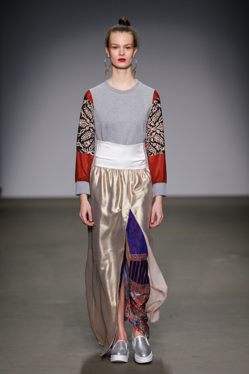 Maison Laponte kicked off the morning of the final MBFWA day. The Italian label presented a simplistic yet feminine collection of mostly duo colored designs. Long tops worn over maxi skirts and floor sweeping dresses in touches of red, white and black. Viscose, known for it’s ability to absorb moisture and contain warmth, was designer’s Gianandrea Sergi’s main choice of winter fabric. The zipper played a big part in this collection (not the first time this fashion week), forming the lining on sleeves and collars. No accessories, but a bunch of zipper decorated bracelets and some extra pairs of shoes, presented on a golden platter. A joyful start of the week and an special experience for the young Italian designer. Gianandrea was excited, we could tell.