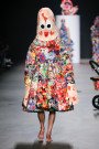 If there’s anyone who knows how to throw a decent catwalk party, it’s Bas Kosters. Year after year he gets the fashion crowd going by just letting music, make-up, backdrop and models in his designs work together. Today was no exception. Bas himself sat on a large block which stood on the catwalk. In Lotus position, like a fashion Budhha he looked at the fashion crowd. As he started spinning, yep, spinning, we’re talking Bas Kosters here, Valentijn de Hingh, opened the show. Naturally dressed in a bright colored, larger than life creation. As the show went on all typical ingredients came along. Tulle, bright colors, structured shapes, glitters everywhere, make-up overdone. Oh and let’s not forget the customized strollers, supermarket carts, dolls and Bas’ face as a backdrop. The music was a little less party, a little more spiritual. Incense and flowers spreading the love during the finale added up to that relaxation factor. An awakening and enlightening start of the weekend. Thanks for a good time, Bas!