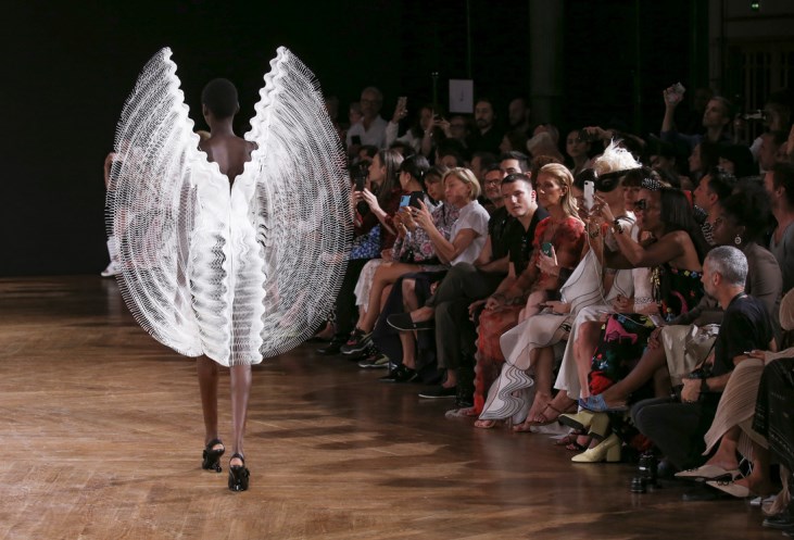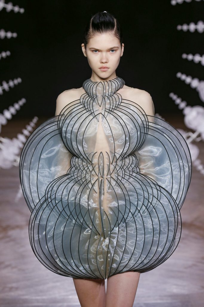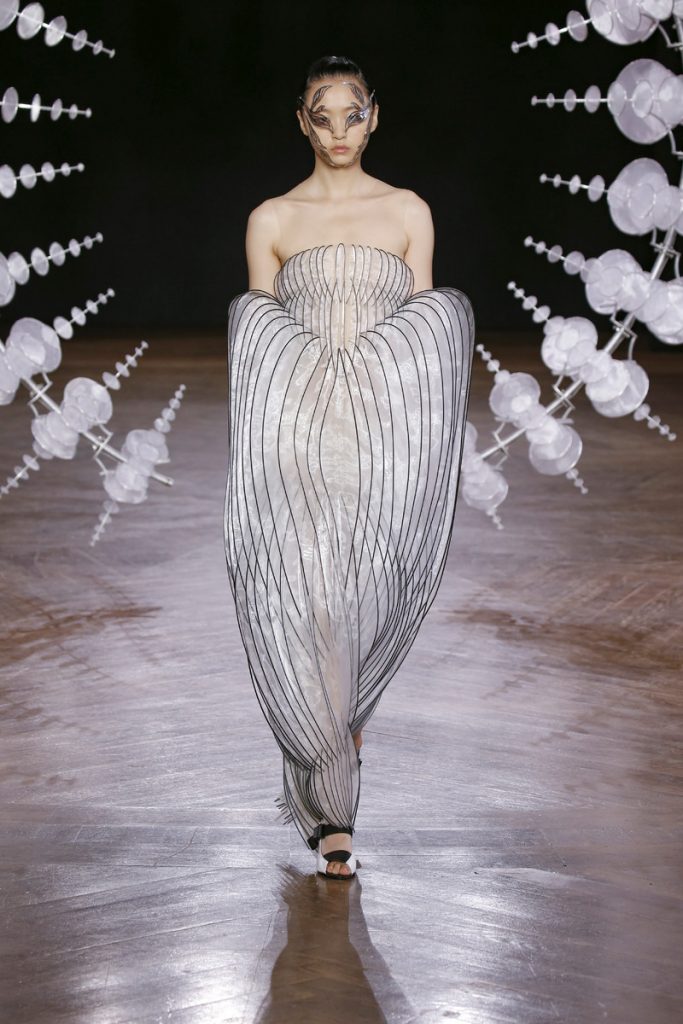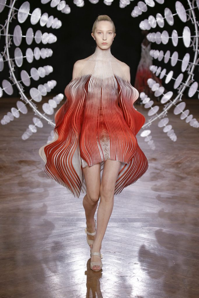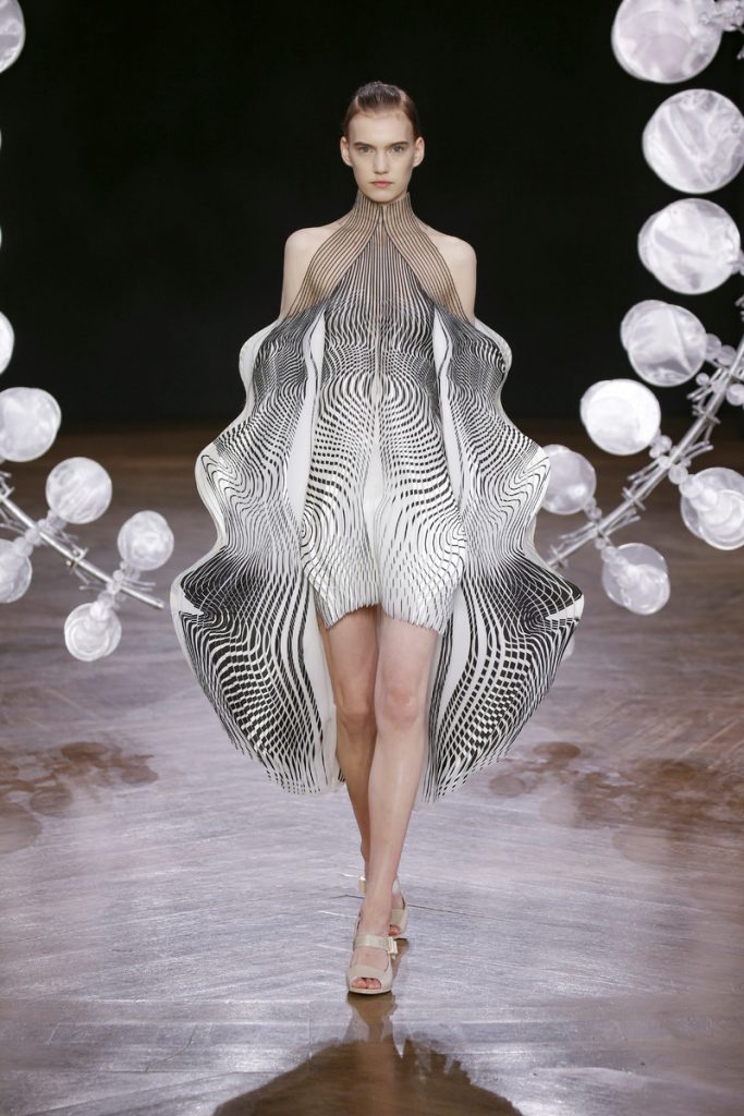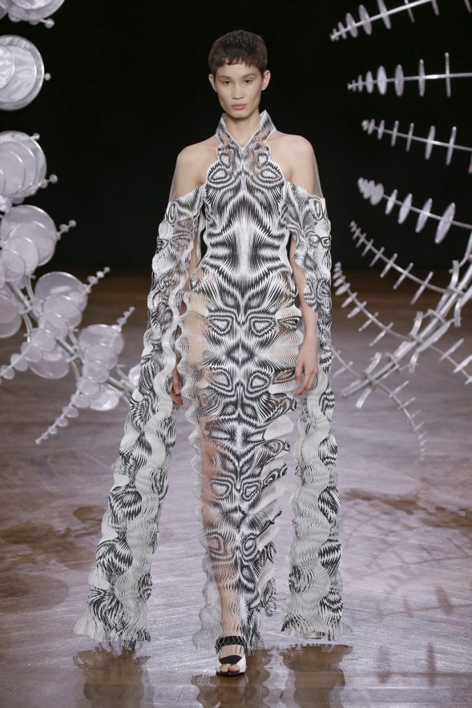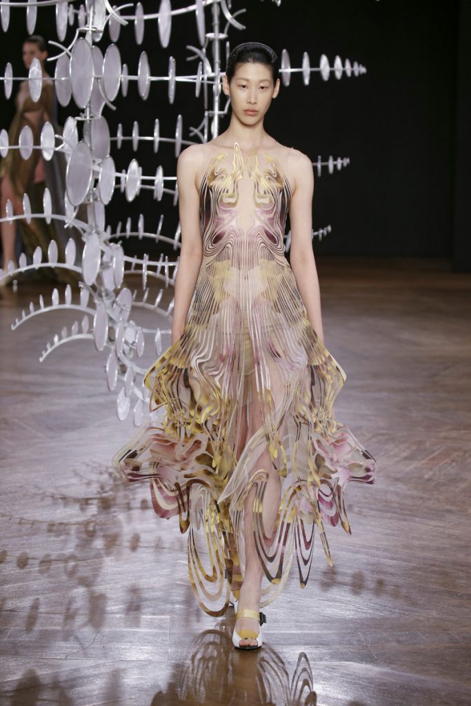 On Monday Dutch designer Iris van Herpen presented her latest couture collection ´hypnosis´. Nineteen laser-printed, heat-bonded and laser cut dresses inspired by the kinetic sculptures of American artist Anthony Howe. As Céline Dion, wearing one of the dresses, watched from the front row the designs gracefully moved (with duchesse-satin cut into thousands of 0.8 mm exquisite waves that each are interlinked, designed to move faster than the eye can follow) with every step of the (run)way. Yet explaining the way these dresses were constructed or made with technology can be as dazzling as watching the designs come down the runway. ´The ‘hypnosis’ collection is a hypnotic visualization of nature’s tapestry, the symbiotic cycles of our biosphere that interweave the air, land, and oceans. It also reflects the ongoing dissection of the rhythms of life and resonates with the fragility within these interwoven worlds´, Iris told the press. Best let the designer explain the process and simply be amazed.