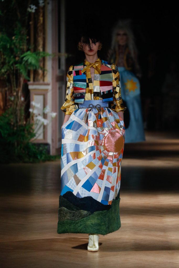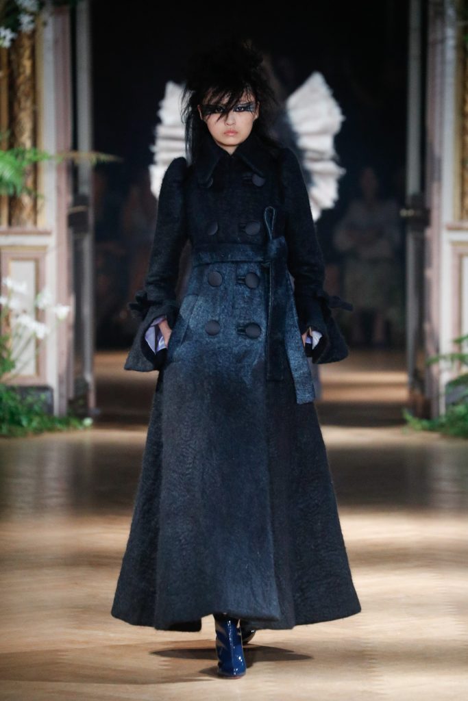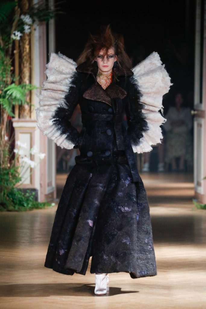 Last season’s collection was all over the internet and went endlessly viral on IG. Even till today, when Christina Aguilera arrived in that “Fuck this Im going to Paris”-dress, it’s a megahit. So how to follow up on a hyped up collection like that? A moody but later on light hearted collection entitled Spiritual Glamour shown at the Westin Hotel was the answer. “Our spell is to transform the feeling of doom about our environment into positive action,” said Horsting. And so the designers collaborated with textile artist Claudy Jongstra. A specific shade of Burgundian black made from botanical pigments turned up on coats and dresses. As the collection slowly became a little more cheerful towards the end when the sun, stars, flowers, butterflies and the usual bows brought some extra optimism. Architectonical shapes, patchwork details, funky hairdos (with little waves) and dramatic eye make-up turned each look into a showstopper. It might turn out as less of a hype perhaps, but with a stronger sustainability message this time. “Our models are like modern witches looking for a spell to make people look at fashion production and consumption differently”, Rolf said. Let’s hope the fashion system is not cursed.