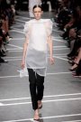 Stella McCartney seemed in a happy mood regarding her ss2013 collection in vibrant whites, oranges and shots of green – and some black. The colors were incorporated into an inventive lineup. In a season where sheer fabrics and layers are seen everywhere, McCartney added layering pants — see-through pajamas under cropped trousers or long, crisp eyelets over snappy shorts. She also used structured organza for an warm-up jacket and sweatshirt. And McCartney combined sweatshirts over a dress in a key motif, superlean ribbed knits featuring big, bright ellipses on sheer plissé. On the tailored side, low-belted jackets and tuxedo-inspired day dresses looked simple and smart.