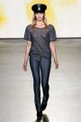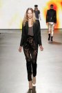 Marije Hellwich only presented eight different looks tonight, but still managed to show a mix of mens and womenswear. She opened her show with a sheer floral printed dress, followed by a satin-like menswear look. Later the transparent items (like a very cool menswear rugsack) were mixed with ultra thick neopreen pieces, like an enormous off white coat mixed with a pair of printed pants and a sand colored top combined with a sheer fringed skirt.