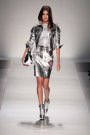 The glitz and glam theme started off subtly with silver shaded ankle boots, yet soon the full on shiny grey-ish/silver looks (skinny jeans and trench coats) appeared. They were followed by ensembles (snakeskin shorts, skirts and old skool jackets) in other metallic tones like light pink, gold-ish and light blue. And towards the end the shiny was even introduced on a few disco chic biker jackets, with every possible shade reflected in them.
