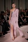 Lak made everything look and feel soft — the (degradee) colors, the fabrics, the shapes. The hues melted into each other. Silhouettes came in fluid satin drapes and swirls, and furs — real and faux — added plush texture. The clothes don’t fall in line with any trend. Here, the looks had something in common with draped modern dance dresses cut with lots of movement. A spare jumpsuit topped with a fur stole would have qualified as minimal if not for its bell sleeves and bell-bottom legs. Shift dresses wrapped in tulle around the shoulders were pretty, interesting but not too out there, and there were lots of great coats — teddy bear furs and a holographic trench.