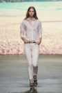 How this all translated into wearable womenswear looks, you wonder? Well, love was written all over the daring, sometimes revealing fabrics. Models paraded around in airy dresses, blouses and skirts made of silks and viscose crepes. Elegant designs mixed with sportive touches. Just as jackets, bombers and shorts added some contrast to the Love-themed collection. Floral prints and stripes met each other halfway. Beige suede pants and a leave printed green shirt formed a rather casual outing. As an off shoulder airy printed dress added some seductive sassiness. Richly decorated T-shirts and sweaters were given an admirable designer touch and the graphic SIS details were unmistakable.