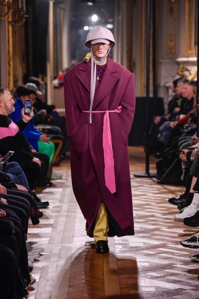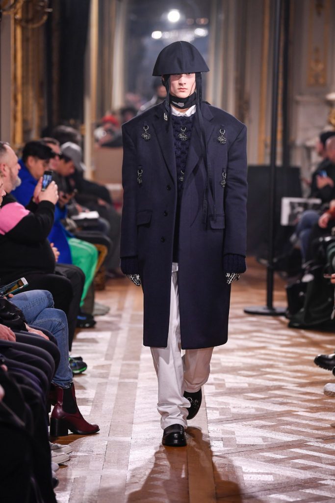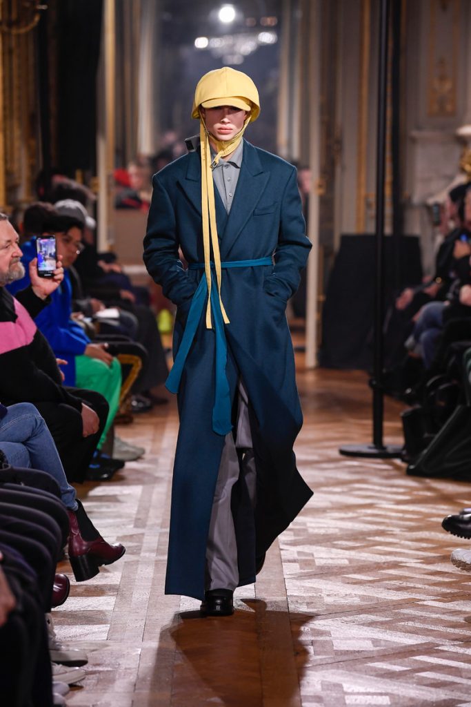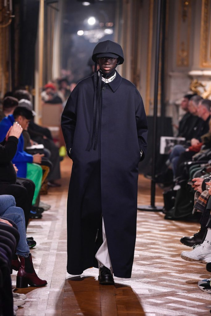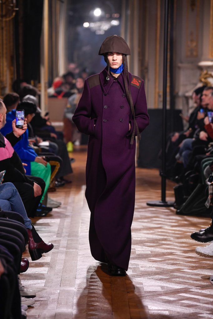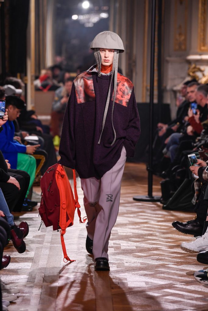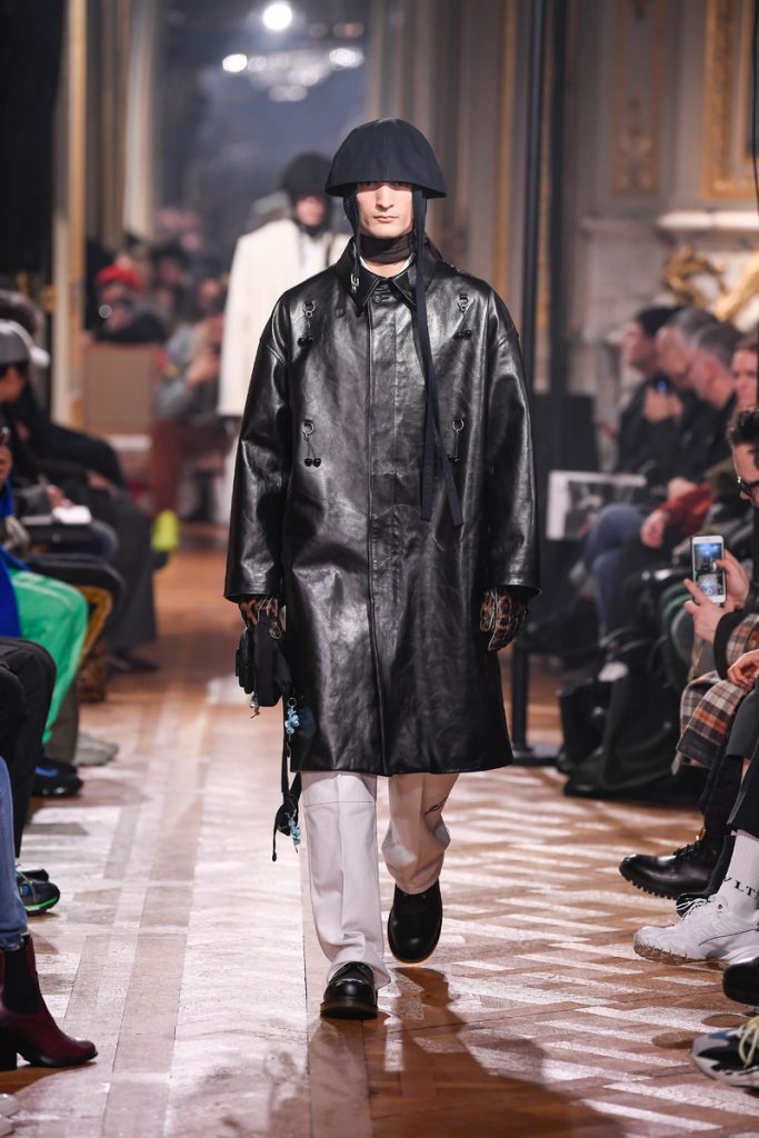“I don’t want to be negative. I want to do something abstract and beautiful and elegant and proud and sophisticated, but without losing the edge of what the brand stands for: the young generation, the dark movies”, Raf Simons stated backstage. And boy did he deliver. His collection mainly spoke of bright colored, strong shouldered long coats and funny hats/helmets. A few leopard prints in the mix too. A leopard printed coat even got a few photographic prints (stills from David Lynch movies) patched to it’s chest. Workwear boots, motorcycle gloves and skull print scarves completed the looks. The show could be divided into two (one with a Joy Division soundtrack followed by a ten-minute intermission and second-half performance by Belgian post-punk band Whispering Sons). Not a word on his Calvin Klein exit, but we’re glad to see he put some extra focus into his eponymous label. Looking for some dazzling fw2019 outerwear? Raf Simons is your man.