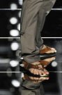Lots of men will never get used to it and some women can’t stand the sight of it but the fact remains that sandals for men are a definite summer trend. And now that the temperature is rising those sunny sandals are popping up everywhere. And don’t think there’s no room for creativity with the men’s sandal; on the catwalk as well as on the streets we spotted lots of different designs. Like the red and beige ones, worn with socks at Louis Vuitton. Or the zigzag printed ones at Missoni. And let’s not forget the purple pair at Dsquared. The only two basic parts of a men’s sandal are: leather and straps, the rest is up to the designer’s imagination. Wear them with shorts, trousers or a wrap dress (like the guy in our streetstyle pics) and just (let your feet) breathe!