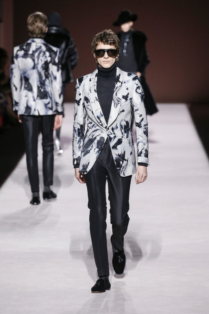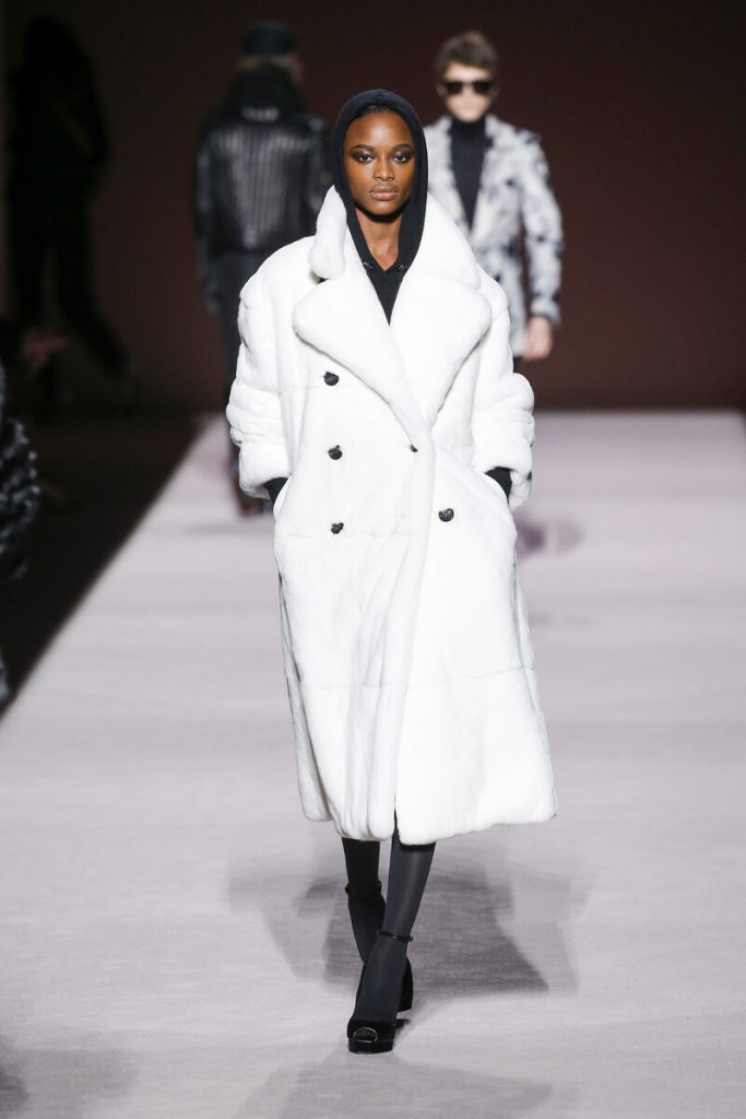 For fw2019 Tom Ford opted for simplicity. Nothing too outrageous or over the top, but a collection filled with beautifully made of wearable, 90s inspired designs in a palette of pink, brown, red, khaki, black and white. Now they may have been simple (or ‘secure’ as Tom Ford called this “search for security”) when taken in from a Tom Ford point of view, they were luxurious and outspoken nonetheless. Shiny silk oversize pants, velvet tuxedo jackets, (tucked in) turtle necks, blouses and hoodies as well as XL fur coats, extreme fur hats and platform pumps formed the daywear for women. For the men Tom Ford created fitting suits in leather or pinstriped. Gloves, scarves, hats, XL sunnies and long puffer coats to match. The finale of evening gowns came in the shape of long asymmetric column dresses with chunky chains around the model’s necks/chests.