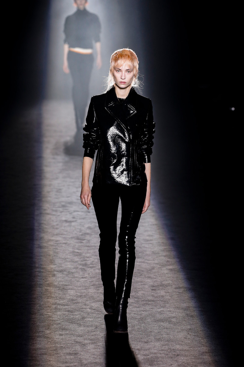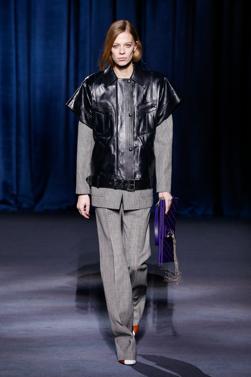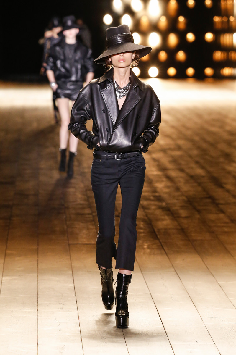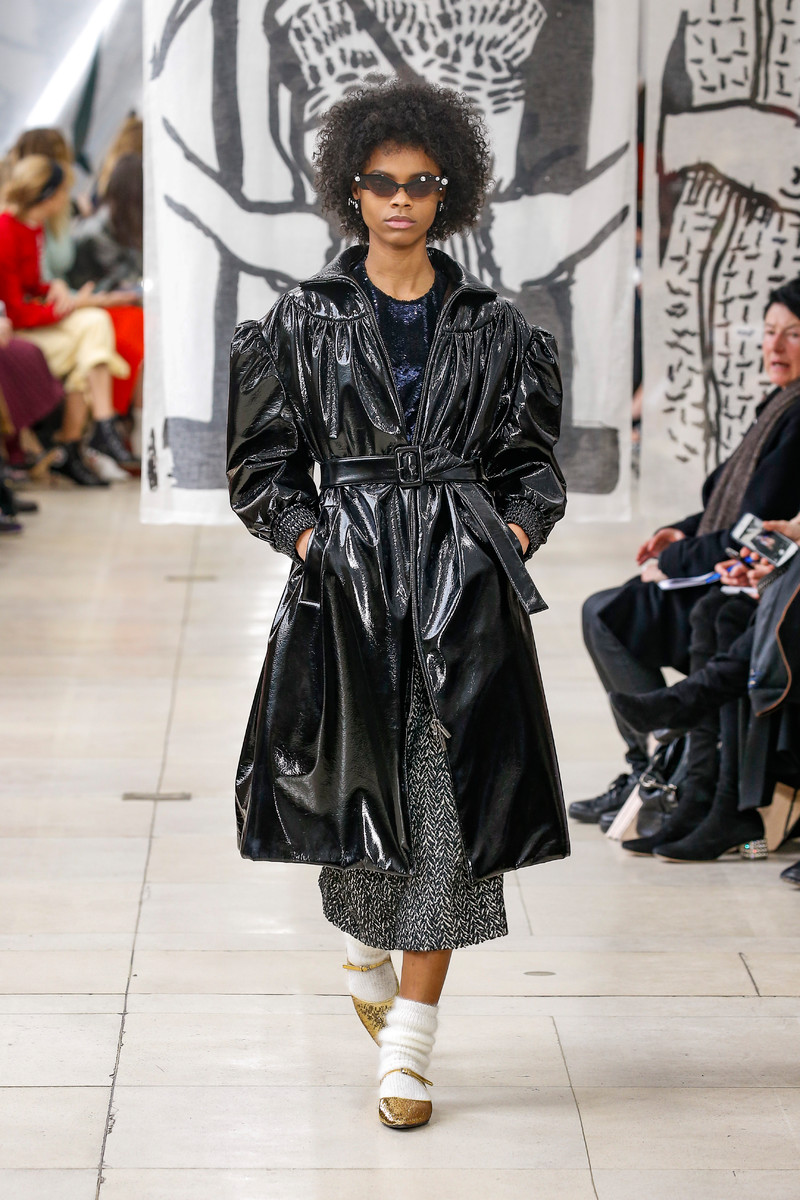 So we’re working a seventies palette, yet an eighties silhouette. Bold shoulders are back, as are the black leather jackets. The power woman silhouette came through strongly at Saint Laurent, Isabel Marant and Versace. Bare legs or a pair of skinny jeans and a bold jacket make up for the eighties look. But there’s more! Patent leather at MiuMiu, Haider Ackermann and Marc Jacobs proof you don’t have to wear color or metallic to wow your crowd. Black leather is your ultimate no brainer for fall. Oh and put on a matching hat for that extra style statement. Eighties redux with an ’18 touch.