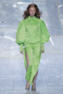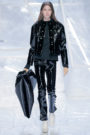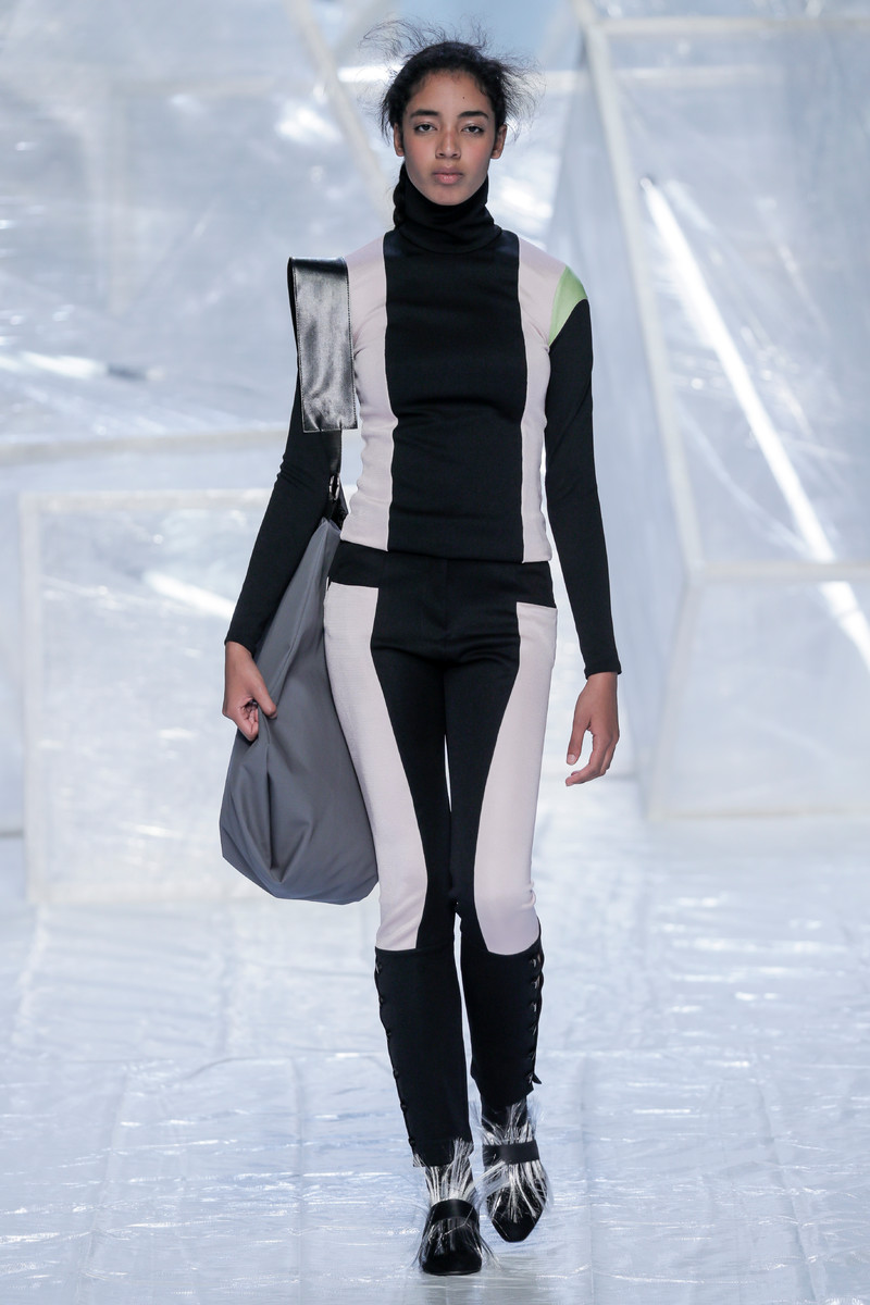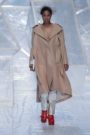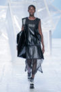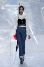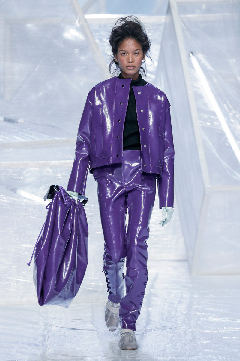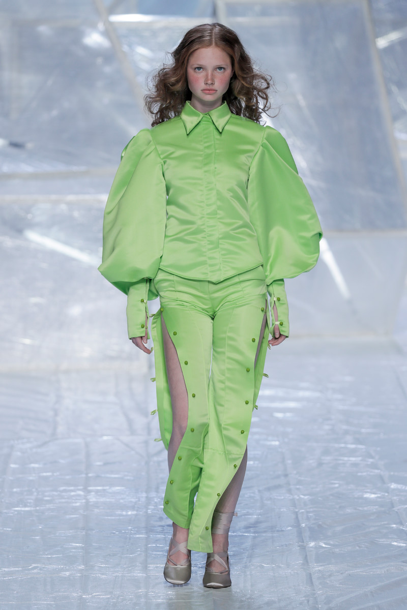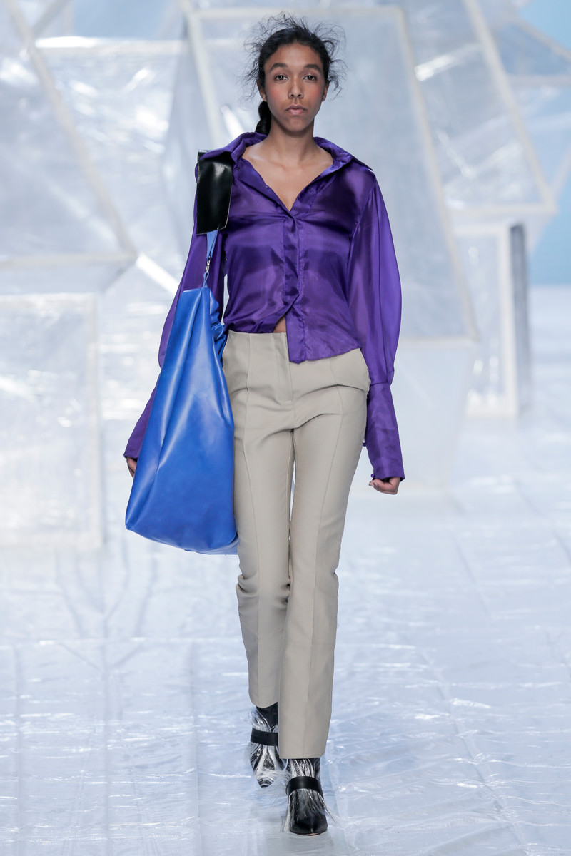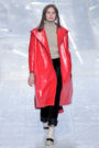 Tung Trinh and Tim Becx have only been around as a designer duo since 2015. But tonight they let everyone know they’re here to stay. They duo presented a fresh, modern and wearable collection of womenswear looks. With transparency and shine beautifully alternated within every outfit. The looks were both sporty and sophisticated. From a camel coat to a long fluid dress, from heavy leather pants and a blouse with XL sleeves to a body hugging suit with blue, black and white parts, a shiny satin green number and a red patent leather coat. The contrast of the heavy leather and the sheerness worked beautifully. Pockets were extra large as were some of the bags; a sign the Trinhbecx woman like to places and bring a whole lot of stuff with her. Lots to see, lots to like.
