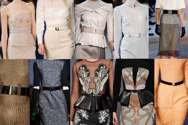 As a result of last season’s peplum hype this fall it is all about the accentuated waistline again. At Etro and Dior we still spotted some gorgeous peplums, yet other brands (Oscar de la Renta, Salvatore Ferragamo, Prada, Rodarte) created the same hourglass effect by belting tops, jackets and even big winter coats.
