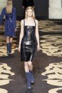 The pleated skirts and jackets, cut from hard, thick leather, worked the pretty side of tough chic while a long white coat sported patchworked fur sleeves. And if Versace showed fewer eveningwear contenders than usual, no matter. The sexy goddess gowns she did send out, with bondage-y busts and gentle feathered trains, were striking.