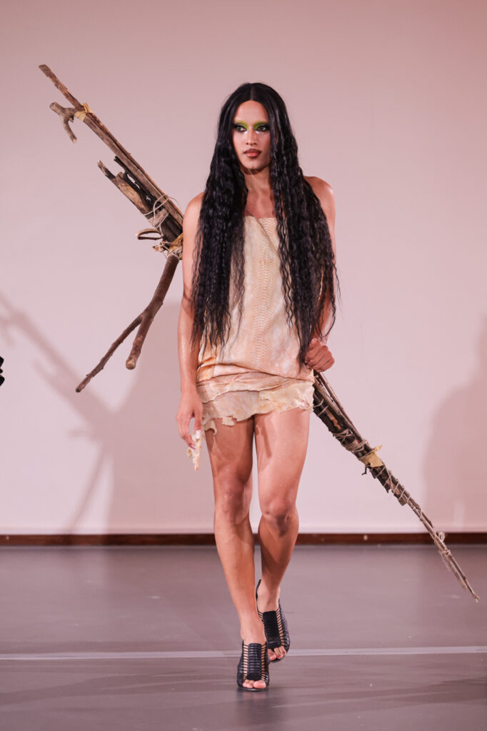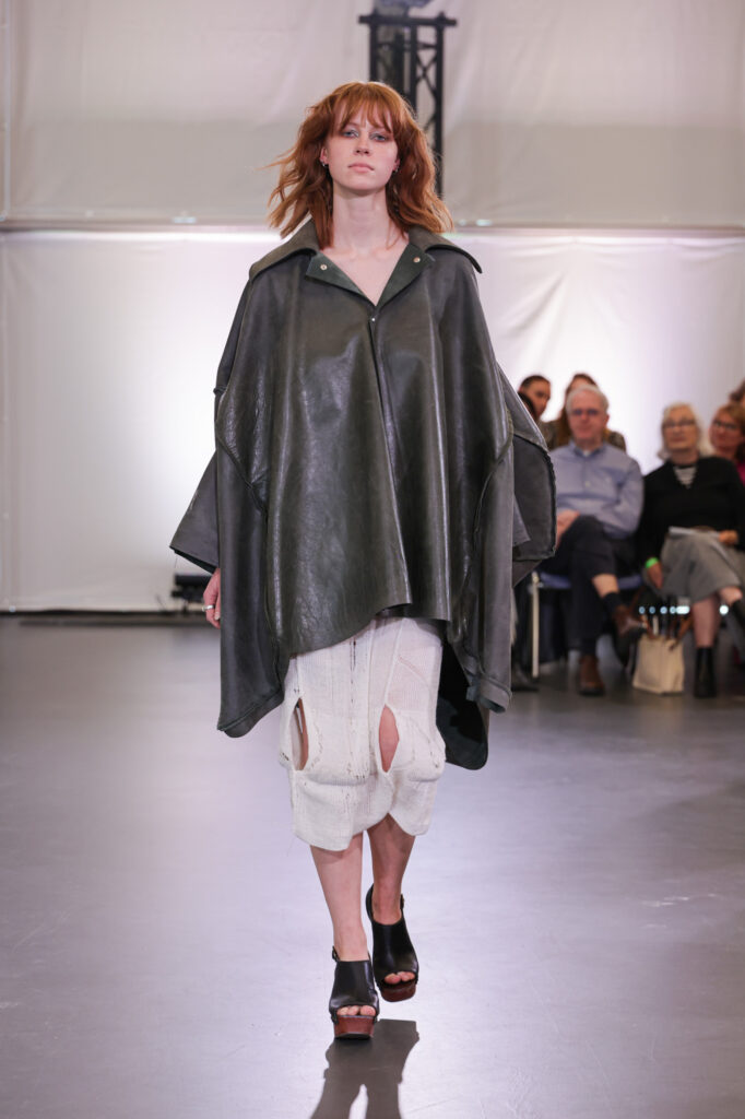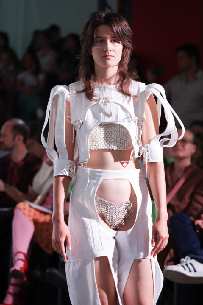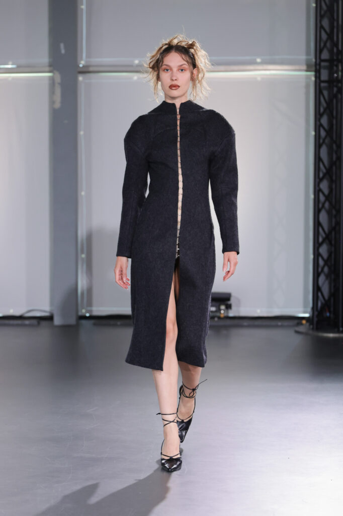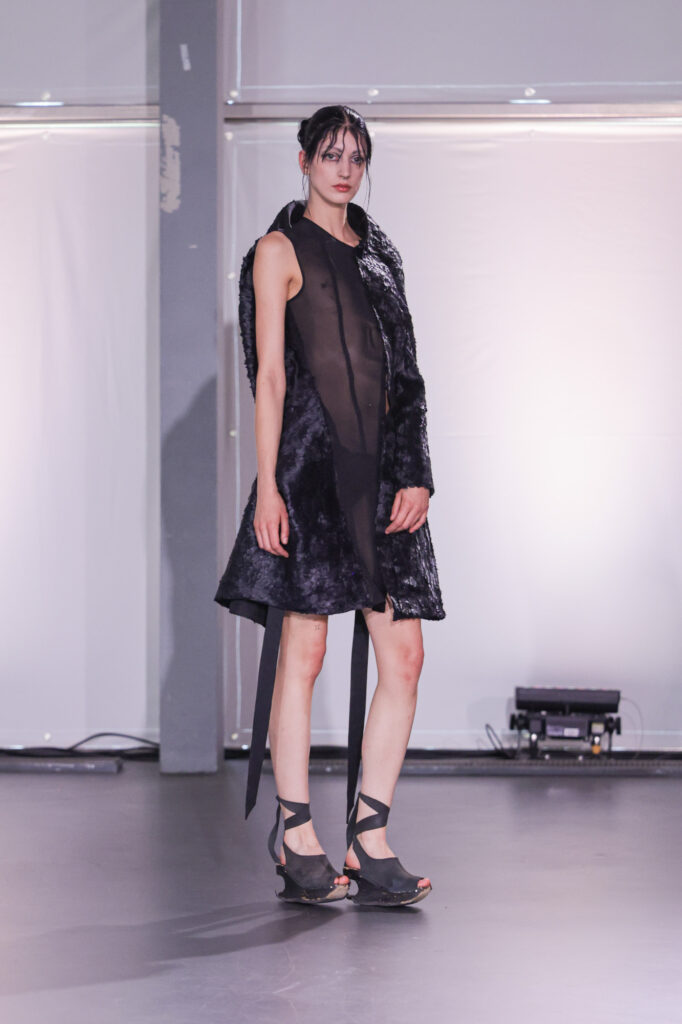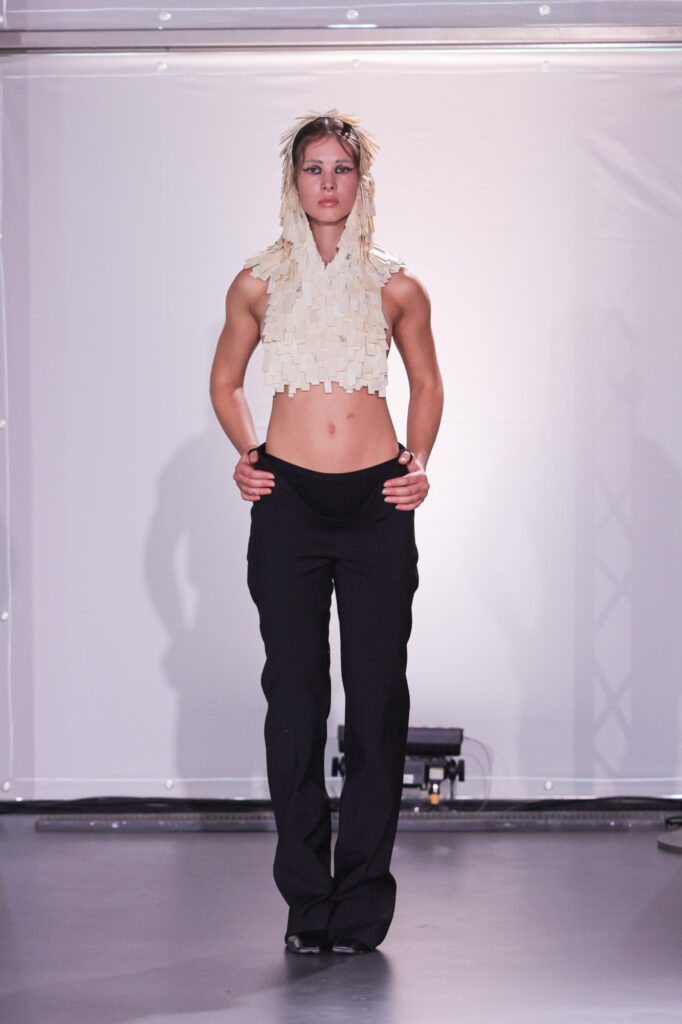 Embarking on a creative journey that weaves together four distinct facets of her personal identity as a Moroccan woman, Yousra displayed a technically immaculate collection drawn from her upbringing in a restrictive Islamic household. Influences from Berber Folklore people in Morocco, Moroccan street style fashion, the vision her parents held for her – a more conservative and modest appearance, and lastly her own sartorial choices. Sensual lingerie against parental modesty, Berber goat skin traditions, and Dutch-imposed stereotypes create a dynamic tension between concept, as well as material and texture choices. Using Geert Wilders’ notorious 2014 “Minder Marokkanen” speech as the backdrop of her show, her collection K*TMAROKKAAN withholds a powerful statement that, similar to her designs, won’t go unnoticed.