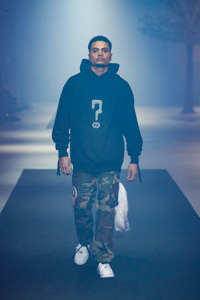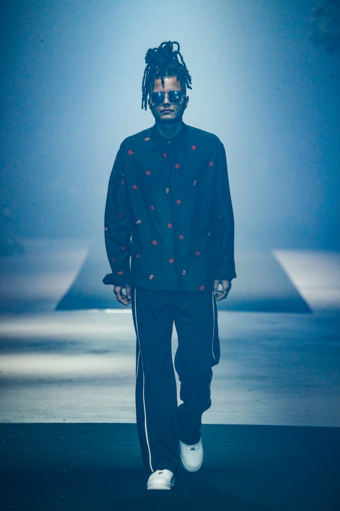 Fashion wise the show was divided into three collections: Chapter I, Chapter II en SS20. Silk blouses combined with cargo pants and T-shirts with the label’s unique artwork. As seen on their Instagram account, the model with the silk granny scarf on his head – a popular look with rappers these days, ask A$ap Rocky, also walked the show.