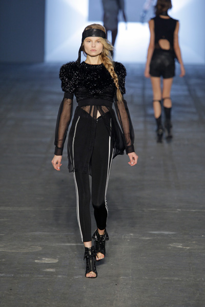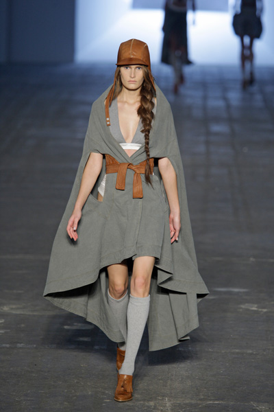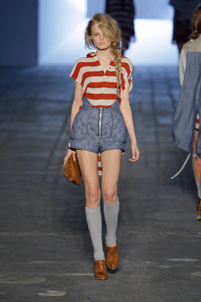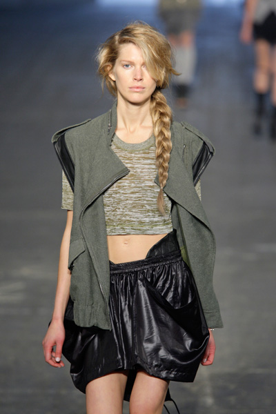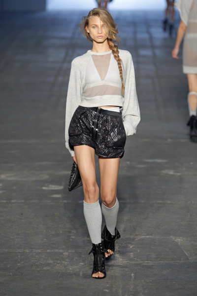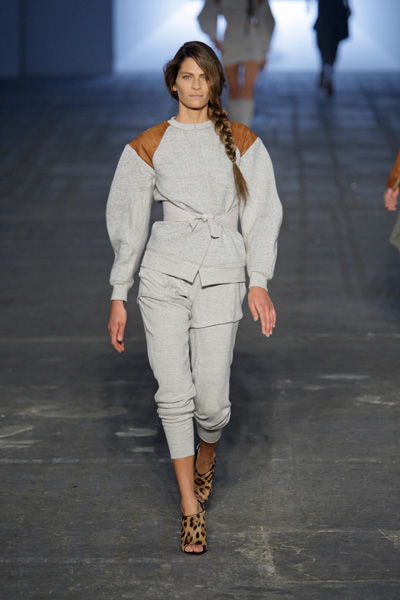 Maybe because of his collaboration this year with the Gap, Alexander Wang has had all-American sportswear on the brain. Wang’s subject was that most popular red-white-and-blue pursuit: football. His goal was investment pieces and the investment elements were, mostly, hooded and utilitarian outerwear pieced together from a variety of fabrics, including nylon and army canvas.