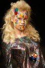 There was something new about Bas Kosters’ womenswear-collection for 2010. The dresses, pants and coats he showed yesterday at Paradiso in Amsterdam seemed more refined, happier and free. His previous collections always had a hint of anger, protest and cartoons, but somehow Bas took a few steps forward now. What he showed yesterday was wearable, beautiful in his own way and colorful. It made us laugh, feel happy and reminded us of our careless childhood-moments. The colors! That glitter! The clogs! The signature Kosters-prints! It felt like a serious ready to wear-collection. And he really made us forget that nasty crisis.