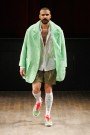 You can leave it up to the Belgian Walter van Beirendonck to send out a happy show with a clear message. This time it was the Trademark- and Copyright-sign that formed the essence of the collection. He showed them on socks, shirts, jackets etc. Walter look-a-like models were parading in quilted bubbly fabrics, bright colors and swimsuits.