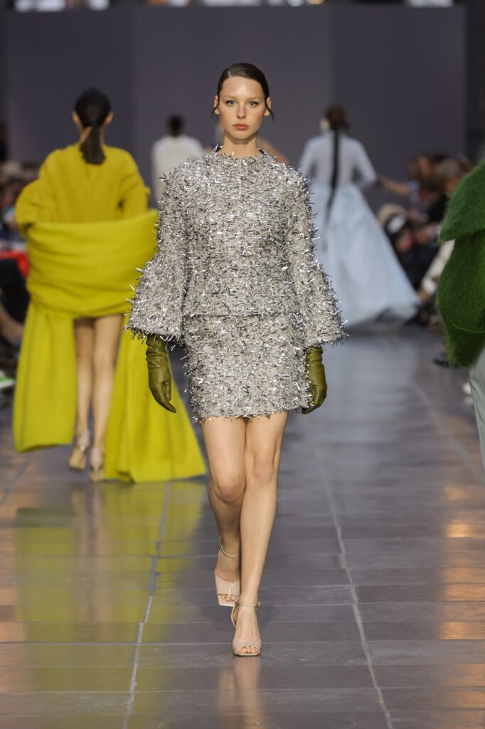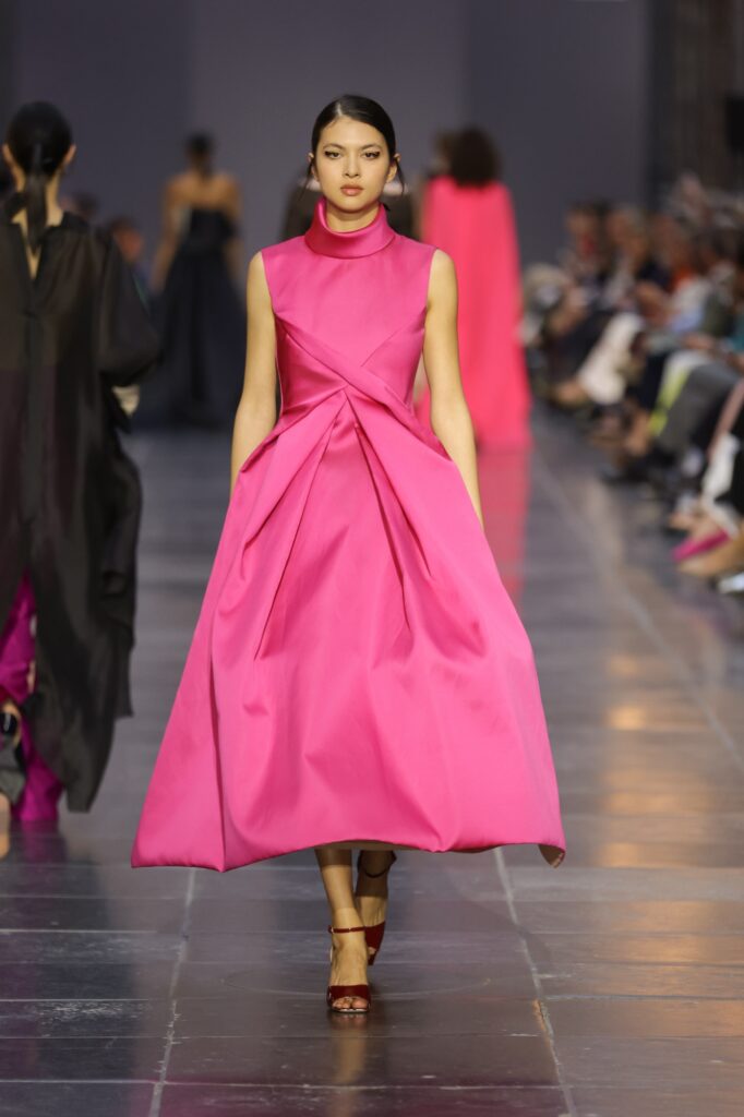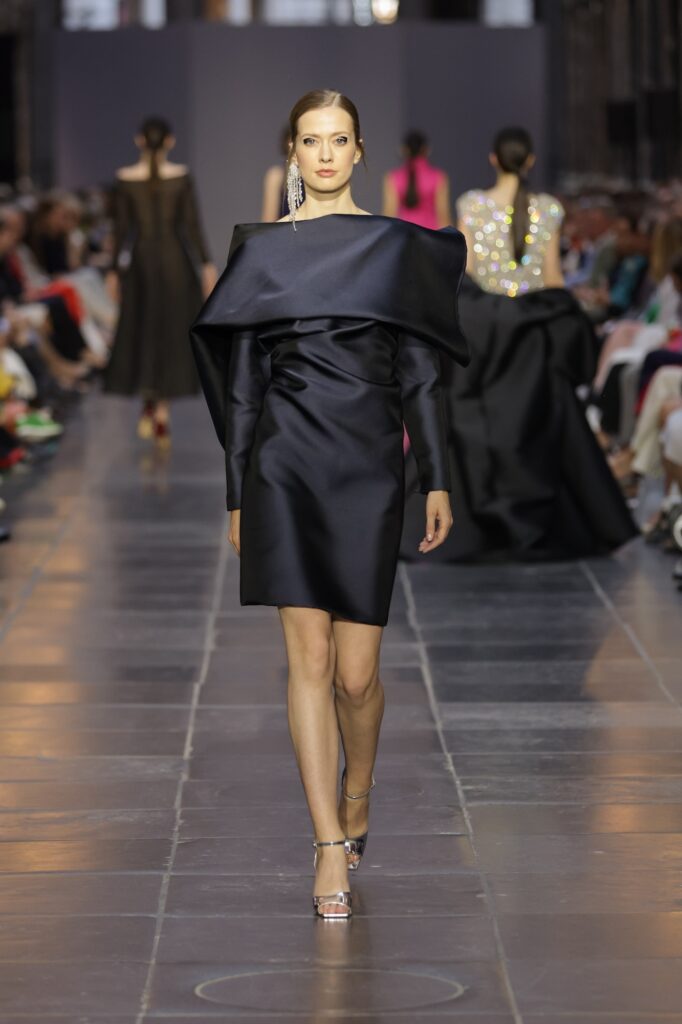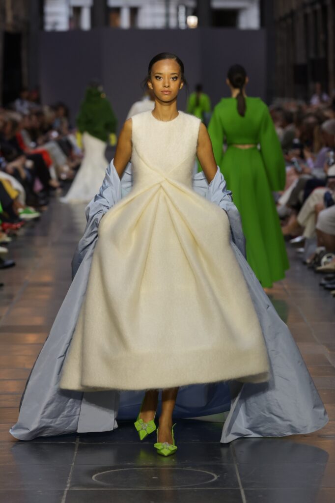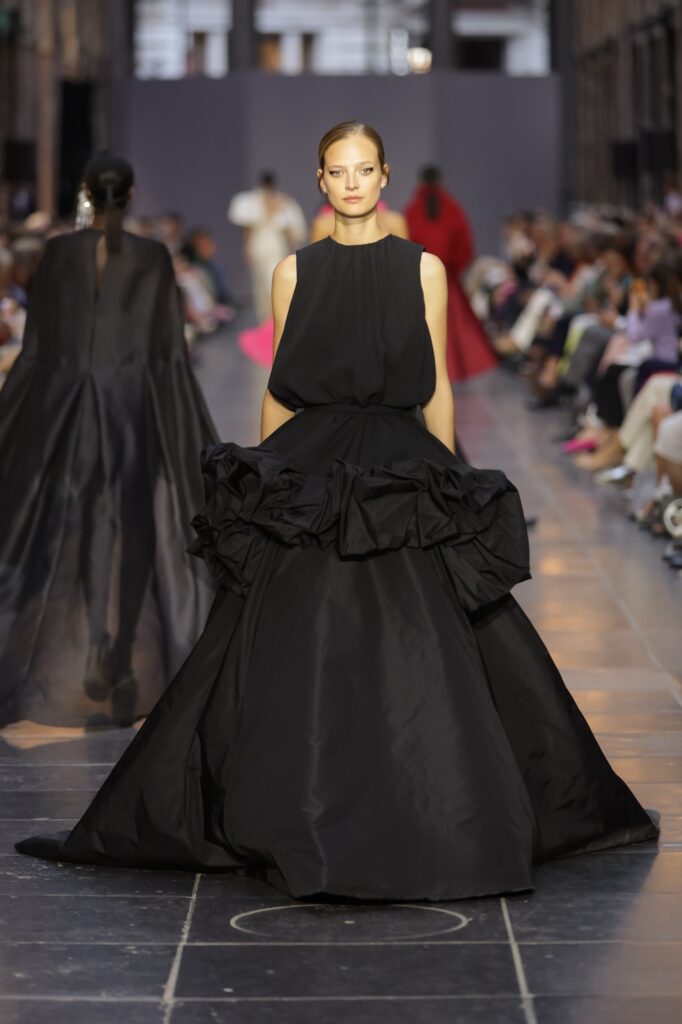 At the Intercontinental Le Grand hotel in Paris, VIKTOR&ROLF showcased a collection of head-turning looks. The show began with a handful of breathtaking tulle dresses in the most delectable confectionary hues. But as the show progressed, the dresses started to appear in the most bizarre positionings – from appearing slightly lopsided and with a bustier placement right up to the model’s neck, to being entirely sideways, as well as upside-down and covering the face. With certain looks, it seemed as if the model was carrying the dress while wearing undergarments. It was joyful, playful and a creative take on classic couture-dresses.