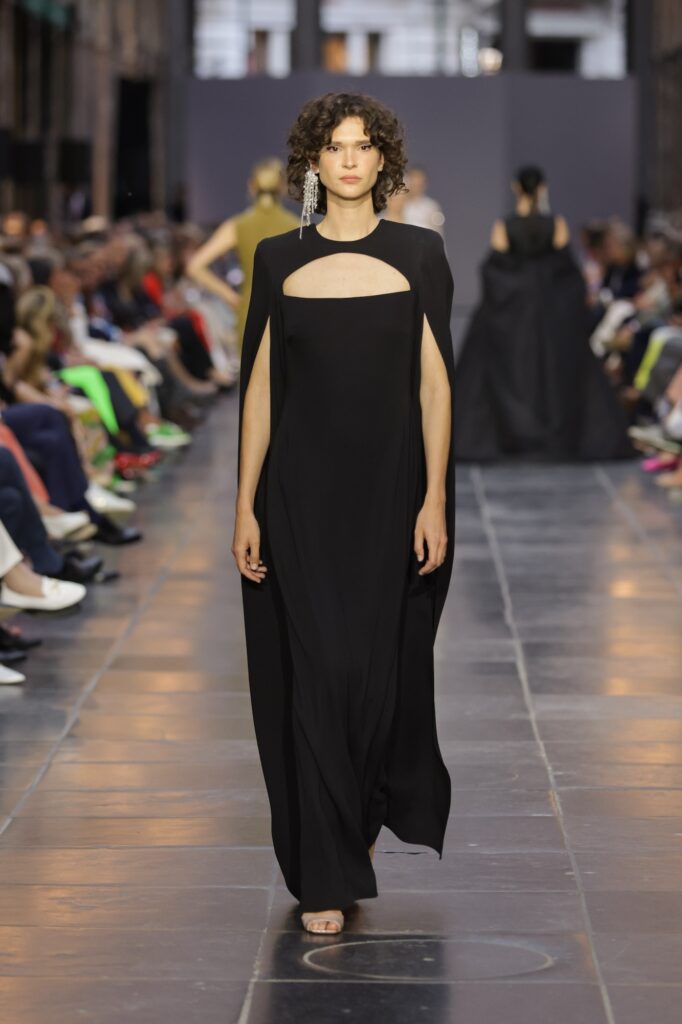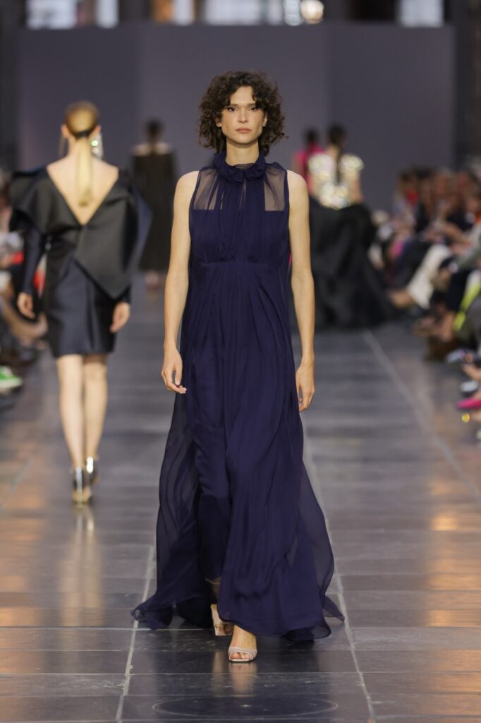 At the Intercontinental Le Grand hotel in Paris, VIKTOR&ROLF showcased a collection of head-turning looks. The show began with a handful of breathtaking tulle dresses in the most delectable confectionary hues. But as the show progressed, the dresses started to appear in the most bizarre positionings – from appearing slightly lopsided and with a bustier placement right up to the model’s neck, to being entirely sideways, as well as upside-down and covering the face. With certain looks, it seemed as if the model was carrying the dress while wearing undergarments. It was joyful, playful and a creative take on classic couture-dresses.
