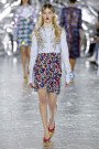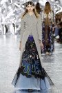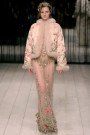 Here was another transporting and hyper-feminine collection from Sarah Burton for Alexander McQueen. Dreamy gauzy dresses in knits as fine as cobwebs; tuberose flowers hand-painted on leather coats and corsets, and feathered skirts made of ostrich plumes that had been lacquered to give them a brooding aspect. The designer decorated her clothes and accessories with talismans and surreal symbols, including pocket watches, butterflies, horseshoes, lips and eyes.