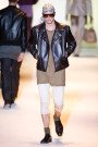 Neil Barrett stepped away from his sporty, street-vibe style and managed to change masculine classics from around the world to a modern universal wardrobe. The look was still urban and fresh, yet more ageless in design. He used batik prints, camouflage, nautical stripes and kimono patterns – reworked and fused together to conjure “an idea of a global masculinity.” The mix of patterns did not overwhelm, because Barrett kept them together with one color story: all gradations of navy and indigo, with touches of black and white. The tight palette counterbalanced a wider spectrum of fabrics, with lots of denim. Low in the crotch but narrow on the hip, cuffed or with rolled-up hems, the indigo bottoms let off an air of American workwear. Barrett performed the trick on non-denim, too, experimenting with slouchy and easy silhouettes as opposed to his usual sharp-cut look. As for tops, the designer went with spring’s hot new category: sleeveless V-neck tunics.