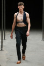 Fresh faced male models walked the runway at Mevan Kaluarachchi’s show this week. They sported the young Sri Lanka born designer’s perfectly tailored collection, which contained just about every piece a man needs during summer time. Like sand colored shorts, denim shorts and even light blue colored shiny shorts. Like slouchy striped pants and narrow pleated pants. Like (slightly transparent) white Tees and longsleeves. Like a cardigan with a baseball fit and a sportive checked jacket with leather details. Like short leather jackets, denim jumpsuits and shiny hooded jackets. Like duo colored sleeveless tops and white shirts. Like a decent leather bag, a cool pair of sunglasses and some casual sandals, all given the Mevan twist.