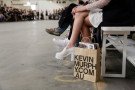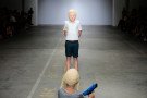 After a video full of tough, tattooed guys was shown, a DJ booth was driven on stage, a violin player stepped frontstage and tough (non tattooed) men with outstanding hairdos entered the catwalk. Their main wardrobe pieces were shorts and (hooded) coats. Shiny, checked, floral printed; the variations kept on coming, ranging in style from classic to sporty. Caps (worn backwards) sunglasses, socks with cut off toes, socks in sandals and leather bags added some fun touches. As the tattooed menswear designer made her statement with printed slogans like “Jesus saves the youth”, “Soul Rebel” and “Forever Young”.