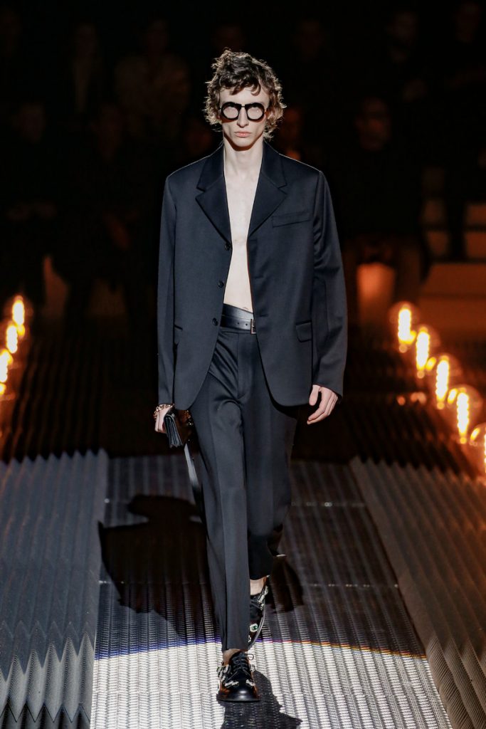 Tonight’s Prada show initially was about the understanding of humanity. And to convey that message Miuccia Prada chose horror movies as the shows theme. From Frankenstein to The Rocky Horror Picture Show. And so the show felt dark and alienated, but in a pretty kind of way. Models wore crazy and colored wigs underneath their hats and caps as they sported a mix of boxy suits and sexy dresses. The utility trend that is now landing in stores was well represented. Large pockets on suits, blouses and even dresses. What made it sexy were the bare shoulders from underneath some of the off shoulder dresses and the multiple belts tied around the waist (for male models too). A dark starting point with quite a seductive outcome.