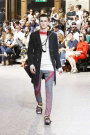 Think American tourists playing golf in the 50s. A touch of Hawaii and American retro with a fun dose of bad taste. Tailored, double-breasted suits mismatch with loud clashing floral printed shirts or pants. Western shirts embellished with rhinestones, recall memories of young Elvis. Prada and Kenzo spice up there ranges with funky, colourful accessories