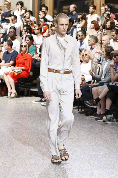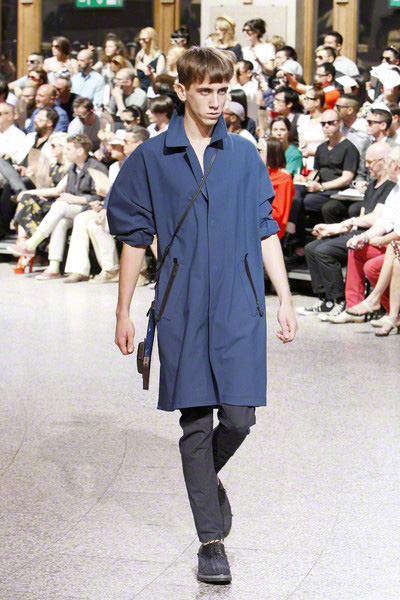 The Lanvin men’s collection for ss2012 continues the search for the perfect suit, jacket and shirt. With references to armywear, sportswear, formal wear and oriental dressing Lucas Ossendrijver presented a his famous casual, sensual yet dressed style. With less and less details, sometimes stripped to the fabric only. There were minimalistic raincoats, wider pants, strict jackets in shiny leather and featherlight sheer pants. The use of layers gave it all a relaxed character.