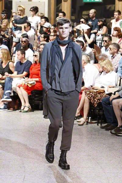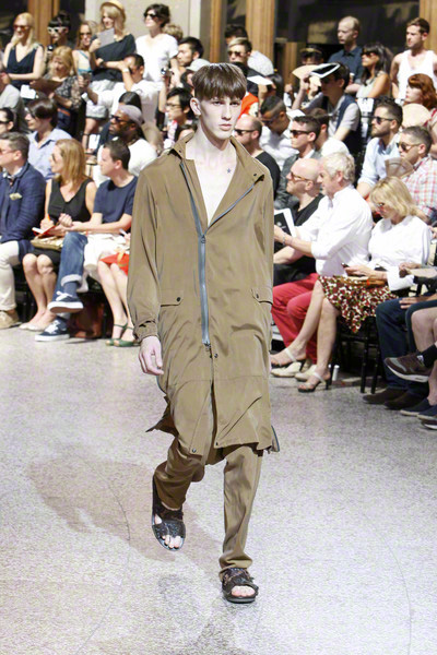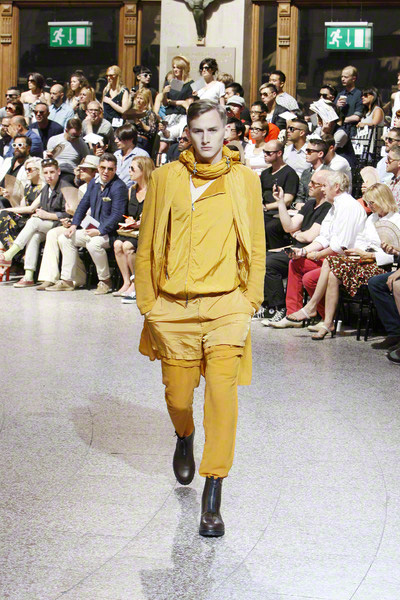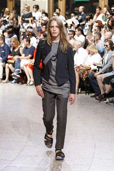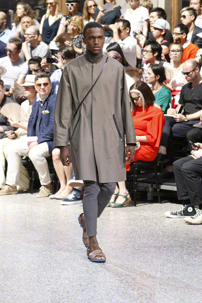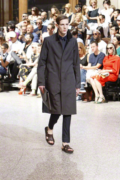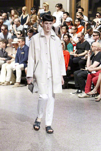 Shirts and tapered trousers came in natural linen and were trimmed in lambskin. Trenches appeared in powdery silk taffeta. Jackets were the stars of this precise and youthful collection, from handsome double-breasted numbers to roomy shirt-like and tunic styles, often closed at the throat and flaring open. The black hats. shoes and leather wristbands were the only contrasting details.