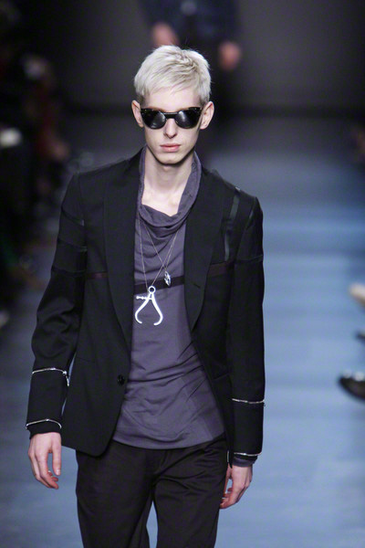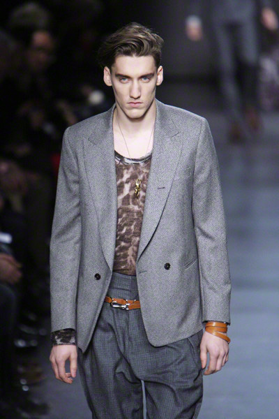 For the YSL:-menswearcollection Stefano Pilati found inspiration at Savile Row and the Mod style so unmistakenly linked to Sixties London and still there. Choosing this theme the designer left the wider pants behind (a fit other fashionbrands are showing this season) and made cigarette-pipe trousers and big shoes the foundation for innovative jackets. Some got a velvet trim, breast pockets, compact lapels and clustered buttons which added a youthful character to the new tailoring.