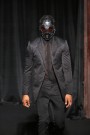 The models had short hair or had their hair combed back. They walked the runway with their hands in their pockets. In between all the male models there were three women. They wore heavy make-up, were dressed in leopard prints and looked kinda creepy. Four of the male models wore a mask that covered everything but their eyes.