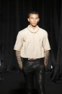 The first half of the collection everything was white. The small pants, the suits with standing collars, the jackets and the wellies. With the last white outfit the showed seemd to be over. Yet a second show started when the first black outfit appeared. The second half of the collection thus was black and in stead of the white cotton Demeulemeester used a lot of black leather.