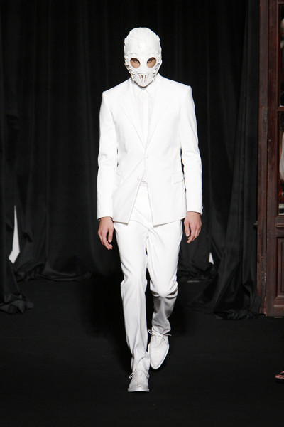Tisci chose Victorian Circus as the theme for his menswear collection. And apparently that meant black & white fashion (with shiny prints in the same color), animal prints and leather masks.