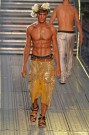 The John Galliano-show was the usual spectacle, with beautiful models painted and dressed to resemble anyone but themselves. Napoleon’s rise was the theme of the collection, but it could also be pirates or a weekend at the Sahara. Clothes were transformed, layered, romantic, floating and colorful. Safari-jackets, shirts turned into sarongs, sand-colored suits and frock-coats as the new outerwear of the season.