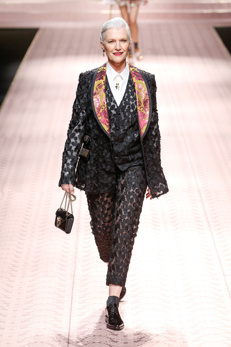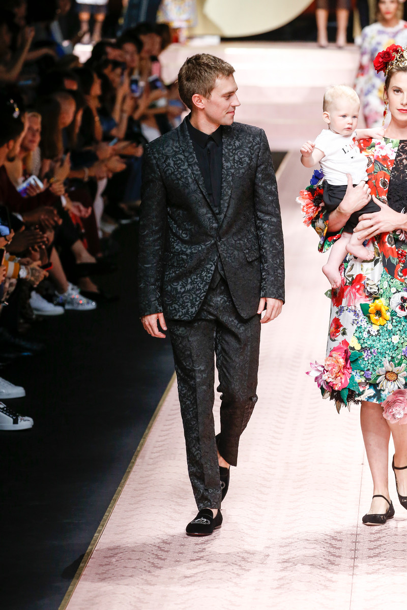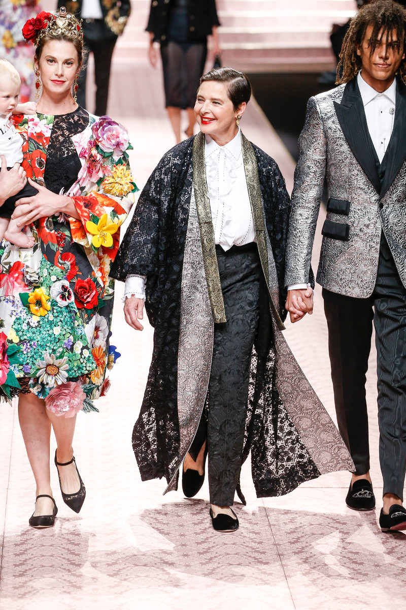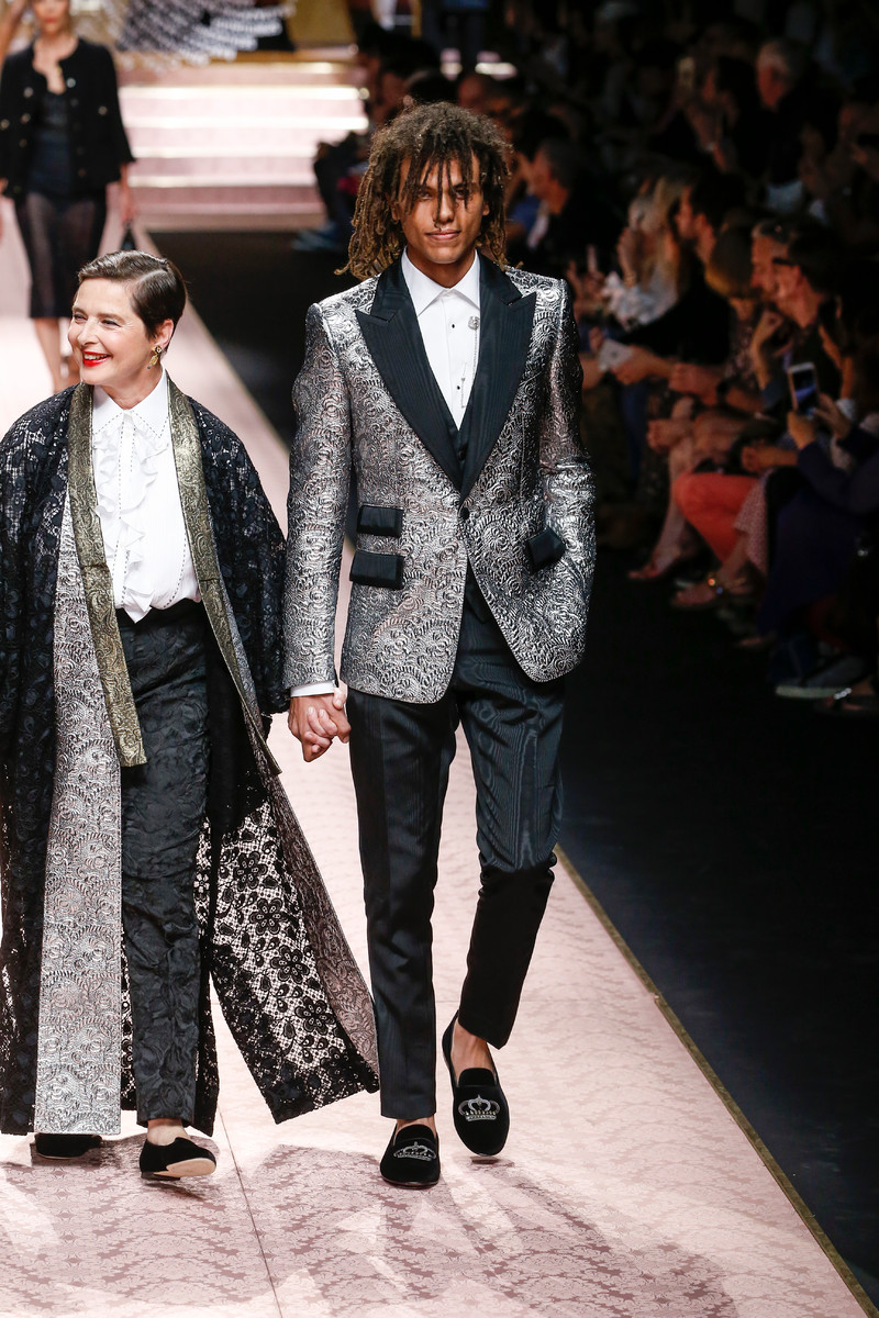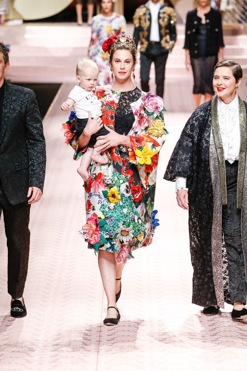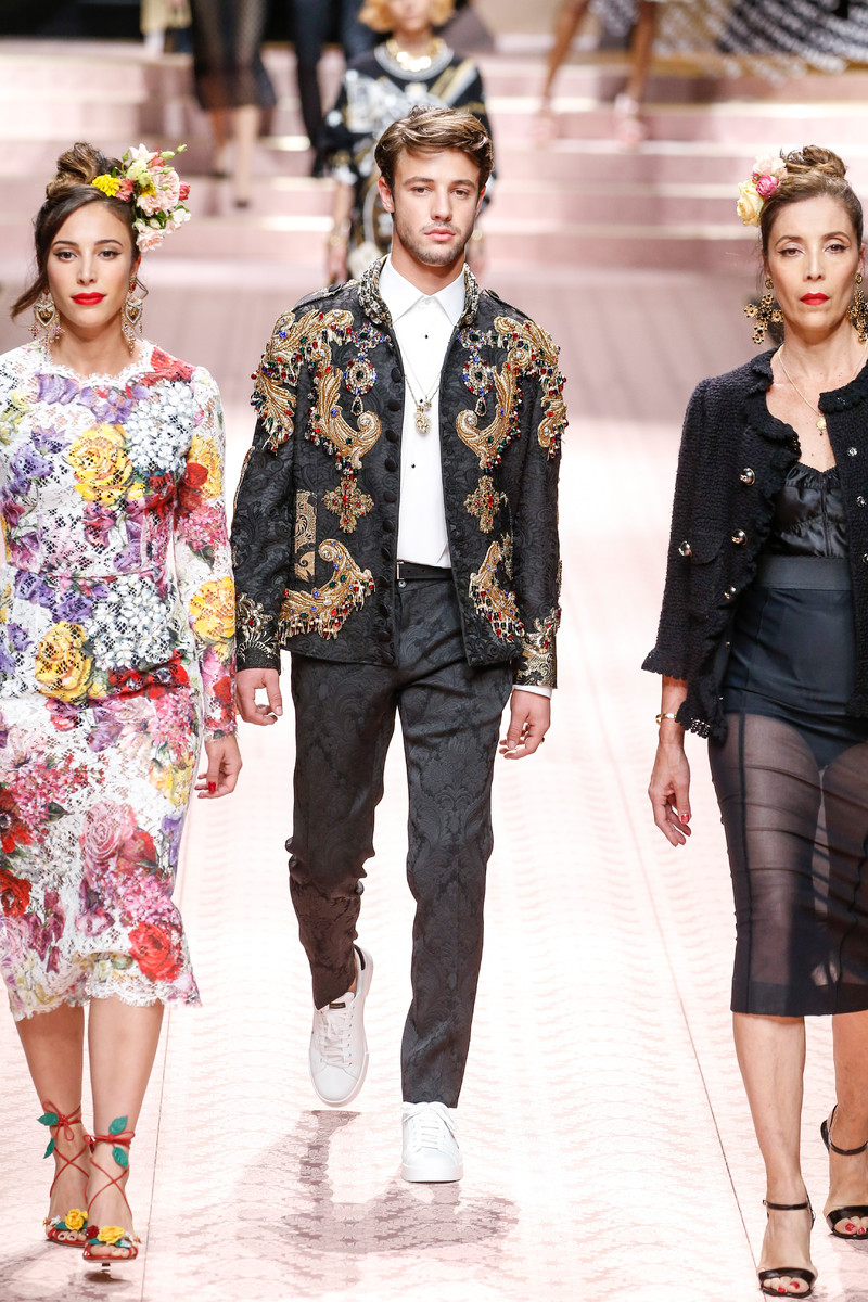 The Dolce & Gabbana show on Sunday was about OK-ness. Which lead to the most diverse Dolce & Gabbana show to date. They casted catwalk icons like Helena Christensen, Eva Herzigova and Marpessa. Monica Bellucci and Carla Bruni walked the runway. The designers did quite some street casting too hiring people from all ages, gender, sizes, skin tone and sexual preferences (lesbian girls walking hand in hand, grandmothers and grand daughters side by side). They were all smiling and very much in a celebratory mood. And who wouldn’t start smiling by the looks of these people in these clothes? Fashion wise it was a true Dolce & Gabbana collection. With jacquard suits, printed (we spotted one farm animal printed dress, lots of floral prints and cathalic references too) maxi dresses and tight little black lace dresses. It was as over the top as always with lots of volume, lots of accessories and a lottt of looks (total of 153). It wasn’t so much a show about new styles or trends. The Dolce & Gabbana shows have been portraying more or less the same style variantions for seasons now. Domenico and Stefano wanted to deliver there message of love. They wanted to show everyone matters and – more importantly – everyone can wear Dolce & Gabbana and look like a star.